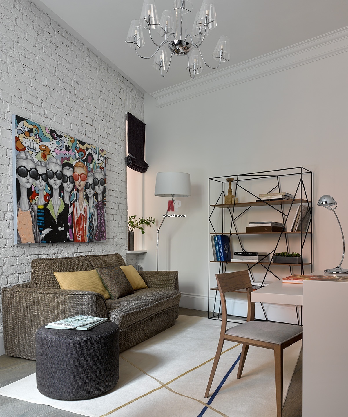 Интерьер кабинета. Окно между кабинетом и гостиной дизайнер открыла, когда начала расчищать стены и демонтировать гипсокартон. Стеллаж, Tonin Casa. модель Naviglio. Письменный стол и стул, ALF, модели Segno и Karina. Диван, DiTre Italia, модель Calla.