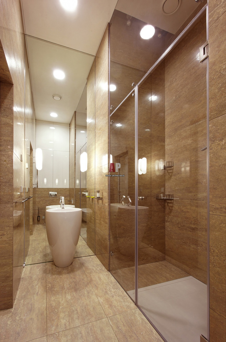 Дизайн-проект гостевого санузла квартиры в современном американском стиле. Зеркальная стена за раковиной увеличивает помещение.