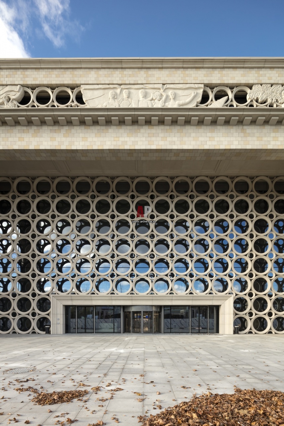 Воссозданы подтрибунные колоннады, а на фасадах – копии исторических декоративных элементов, масштабированные в новых габаритах здания.