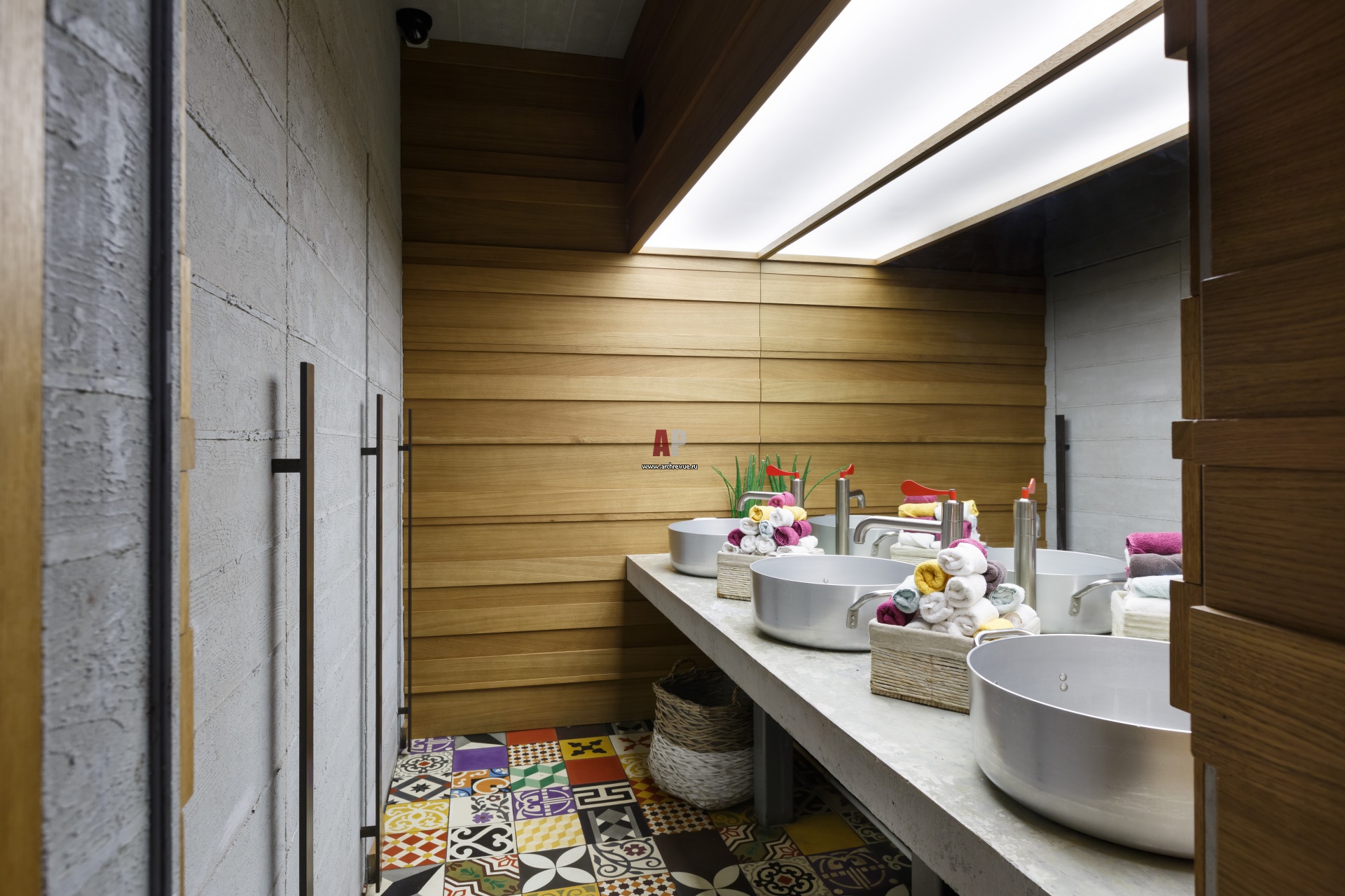 Туалетные комнаты в ресторане. Стены вокруг умывальника зашиты доской, двери в кабинки и столешница отделаны микроцементом. На полу цементная плитка, Carocim. Вместо фаянсовых моек – металлические кастрюли Ballarini.