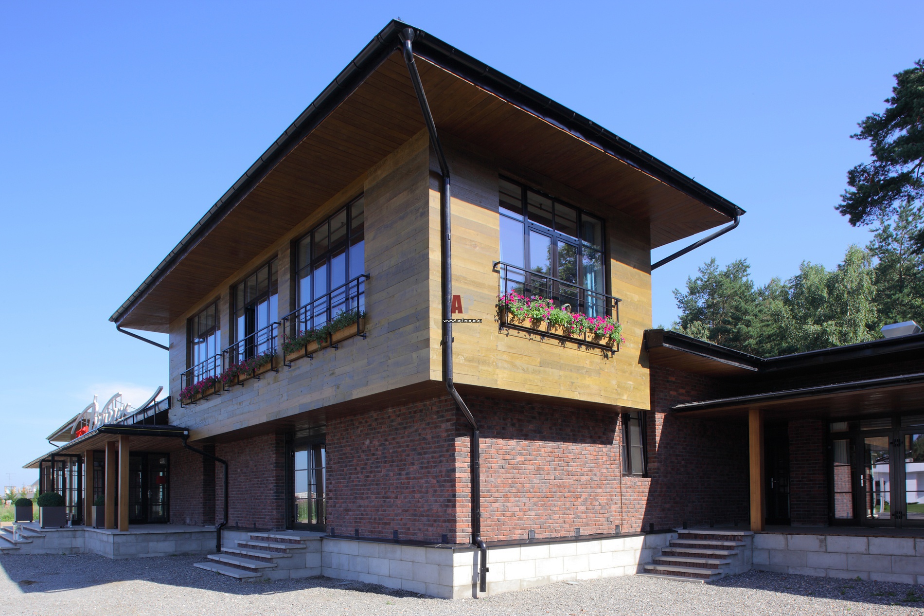 Здание ресторана построено в стиле альпийского шале, фасады декорированы кирпичом и деревом.