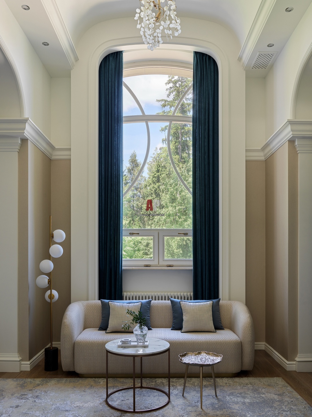 Холл второго этажа. Столик, люстра, Garda Decor. Шторы с электрокарнизами.
