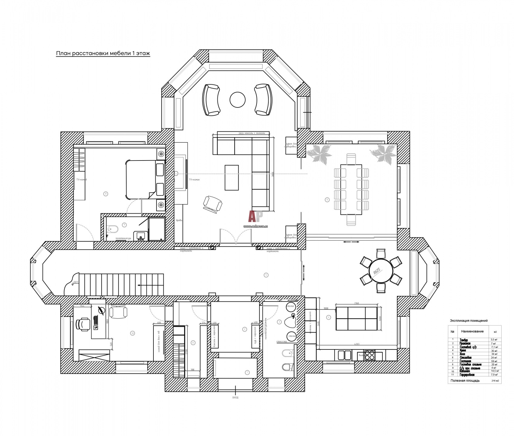 Планировка 1 этажа 3-х этажного дома в Подмосковье. Общая площадь - 650 кв. м.