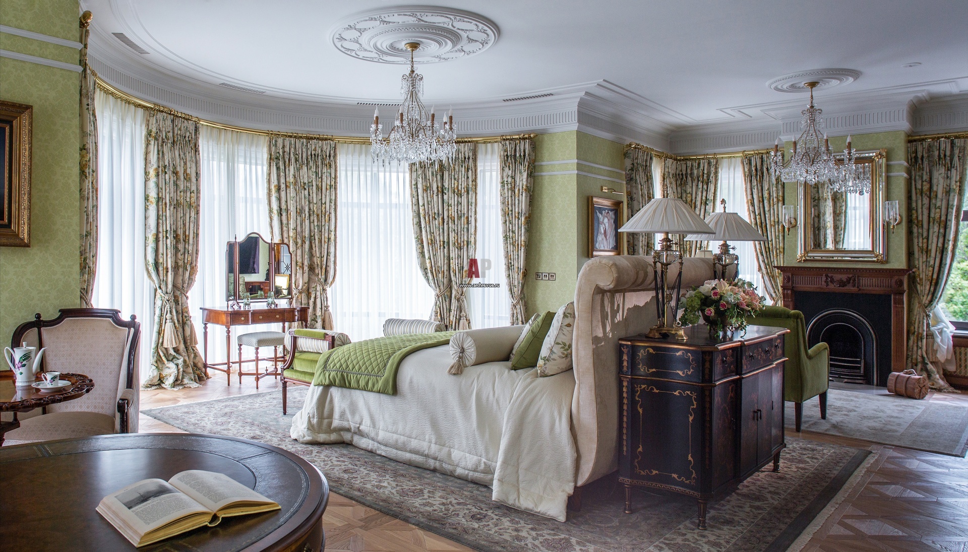 Хозяйская спальня с эркером расположена на втором этаже, она состоит из нескольких зон: зоны сна, будуара и уютной каминной группы с диванами. Кровать и кресла, Hickory Chair. Туалетный столик, Titchmarsh & Goodwin. Комод, Decorative Crafts. Люстры, Badari Lighting. Портьеры, Sanderson. Аксессуары для текстиля, Haywoods Trimmings. Мебель, свет, ткани – поставщик Charles.Cameron.