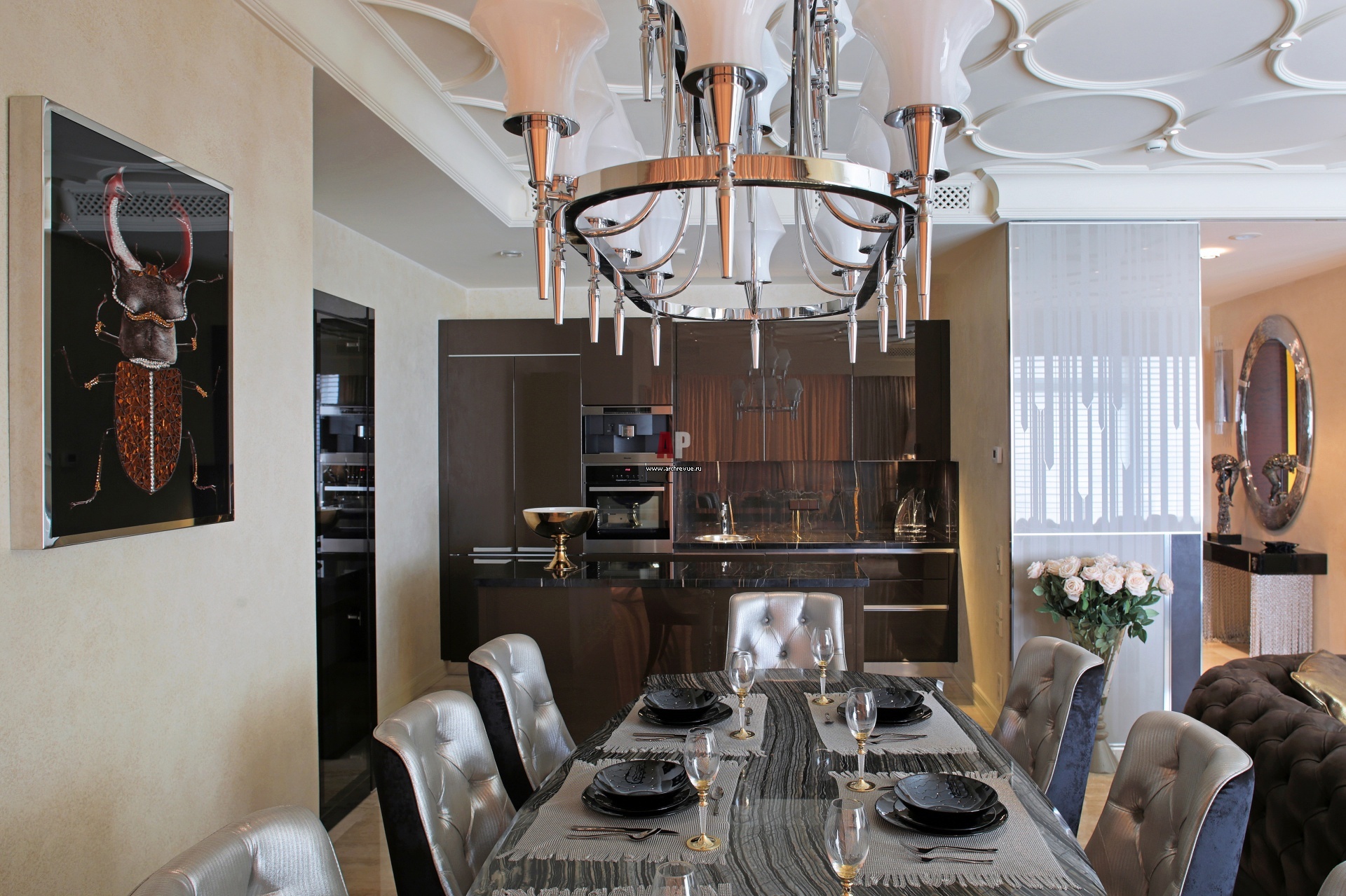 Кухня решена в едином пространстве с гостиной. Ее фасад из лакированного дерева органично вписался в жилой буржуазный интерьер. Стол с каменной столешницей, стулья, люстра с хромированным основанием, Visionnaire.