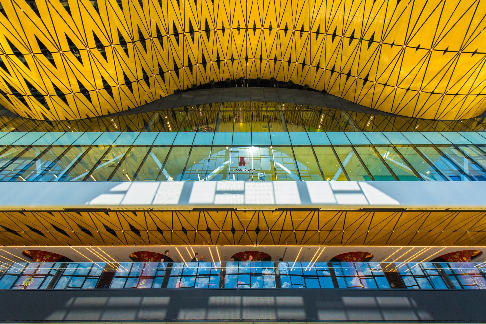 Дворец гимнастики Ирины Винер-Усмановой в Лужниках. Потолок фойе подшит золотыми панелями из алюминия.