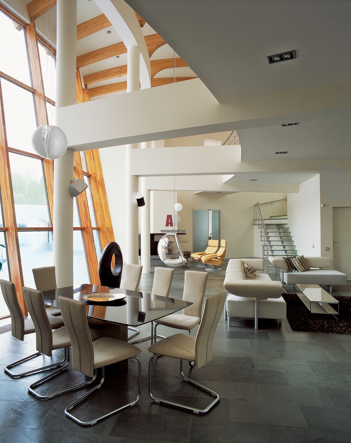 Объединенная гостиная-столовая в стиле минимализм. Центральный элемент общего пространства – сложная пластика потолка. В основе его конструкции – гипсокартонные балки, которые с одной стороны упираются в несущие колонны, а с другой проходят сквозь слой широкой полукруглой деревянной панели.