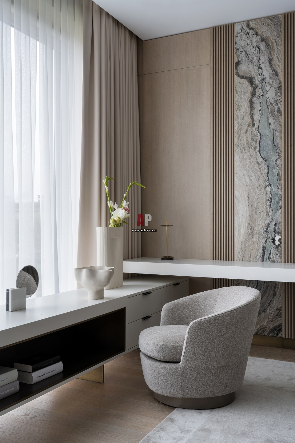 Блок мастер-спальни выполнен в серо-бежевых и жемчужных оттенках. Под окном – низкая тумба, переходящая в консольную длинную полку. Она служит также небольшим рабочим столом хозяйки дома.