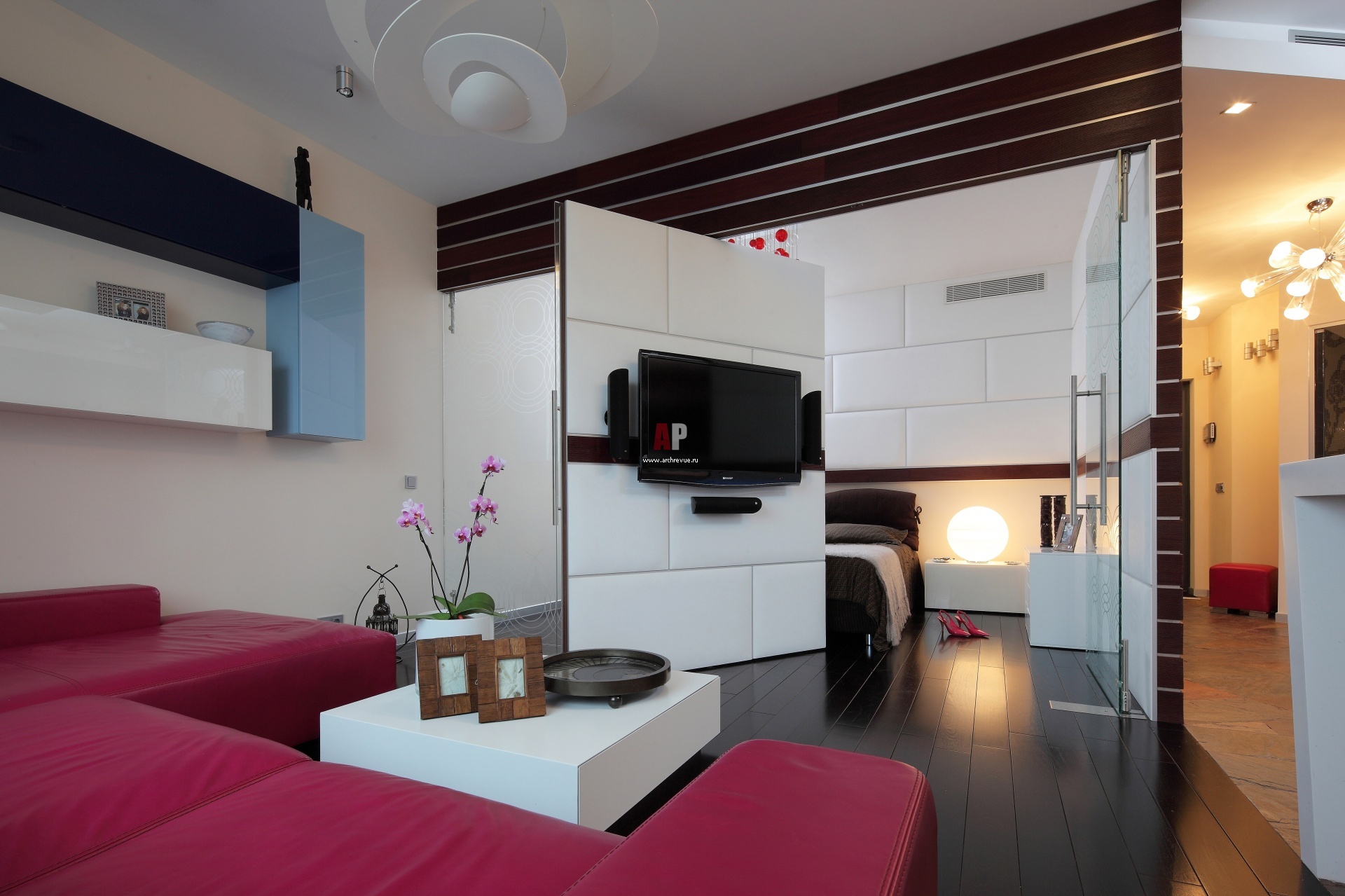 Интерьер женской квартиры-студии в современном стиле. На полу жилой зоны – половая доска из венге под матовым лаком. Красный диван, Relotti. Стеллажи, системы хранения, Lago. Столик, BoConcept.