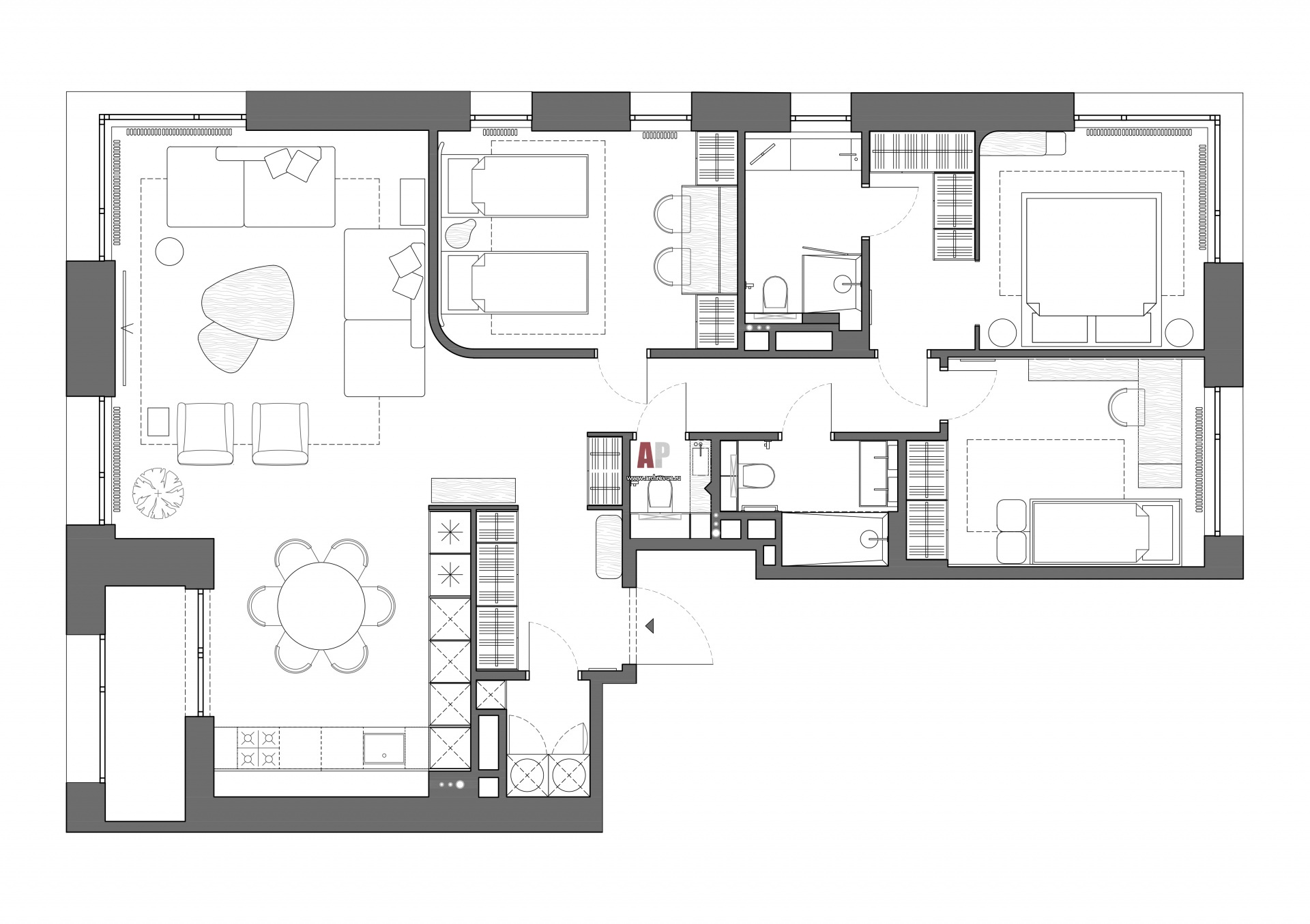 План четырехкомнатной квартиры для семьи с тремя детьми.
