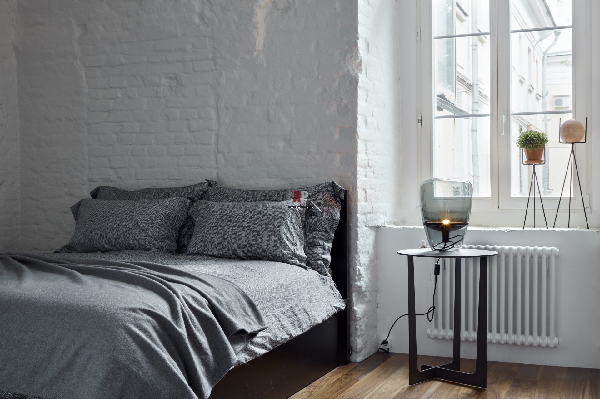 Для хранения в спальне имеется большой встроенный шкаф с белыми фасадами и вместительный короб в кровати.