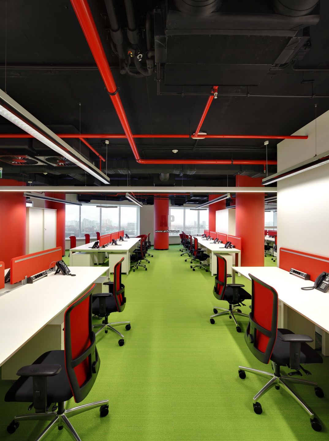 Маркировка открытых потолочных инженерных систем красным цветом своей выразительностью напоминает «кровеносную систему».