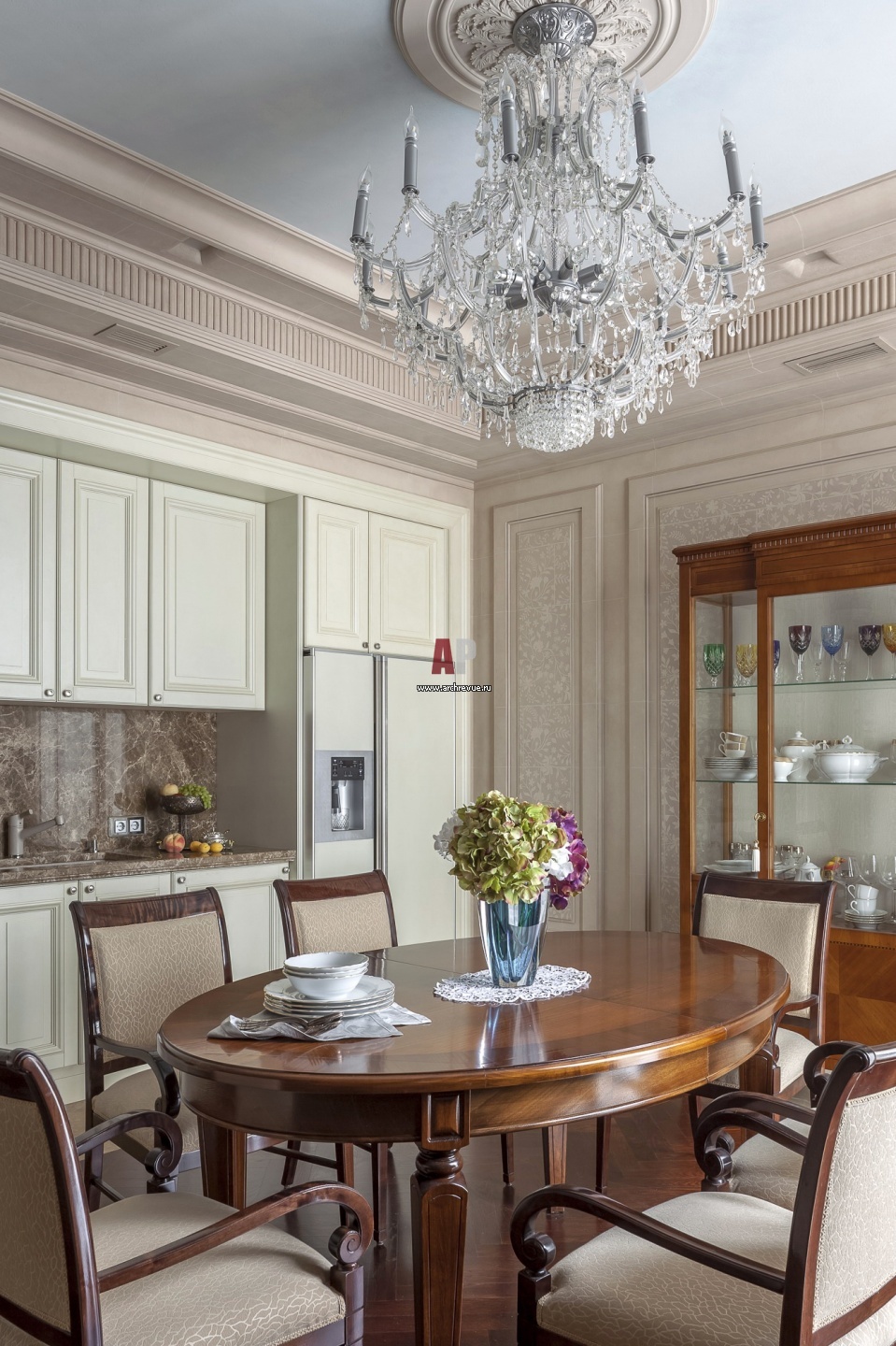Кухня встроена в нишу. Гарнитур с закрытыми фасадами цвета слоновой кости и нейтральным декором гармонирует с классической обстановкой гостиной. Столешница и фартук из мрамора Emperador light.