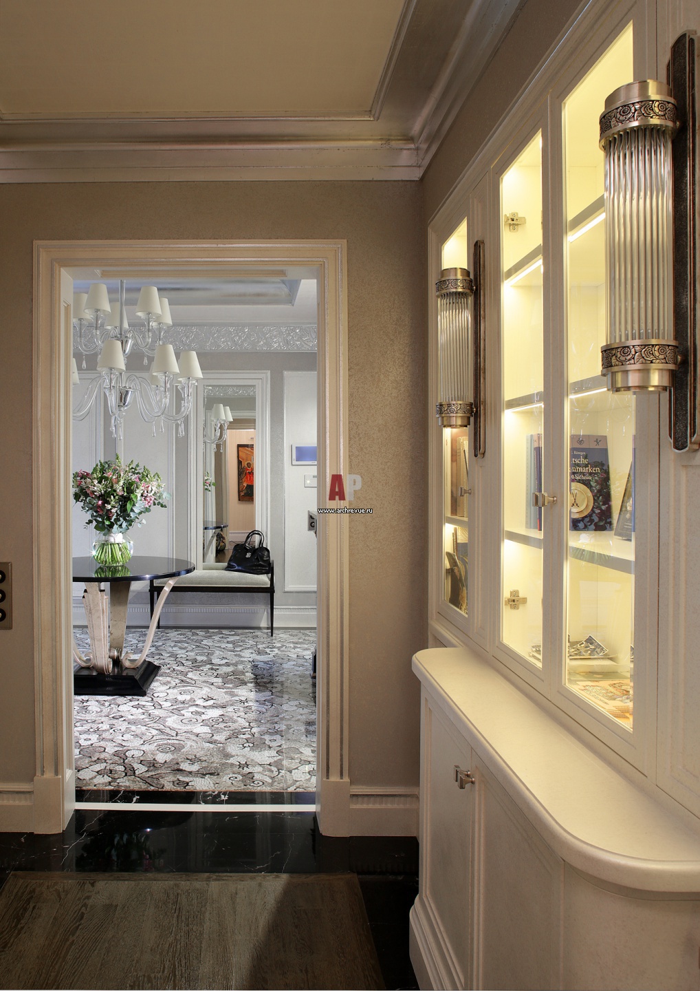 Вид на прихожую в стиле ар-деко. Мебель, свет, по индивидуальному проекту. Дверной портал, плинтуса из дерева с декоративным серебристым финишем.