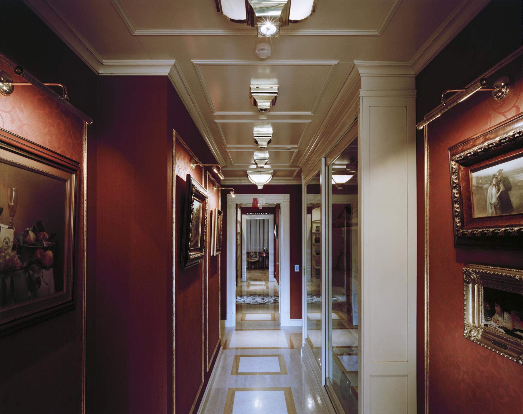 Один из коридоров, ведущий в спальню. Он так же оформлен с помощью дерева (потолки, шкафы, фабрика Grande Arredo) и финишных покрытий, «Студия Марата Ка». На стенах - классическая раскладка с золочением, которая служит дополнительным обрамлением для размещенных здесь живописных полотен.