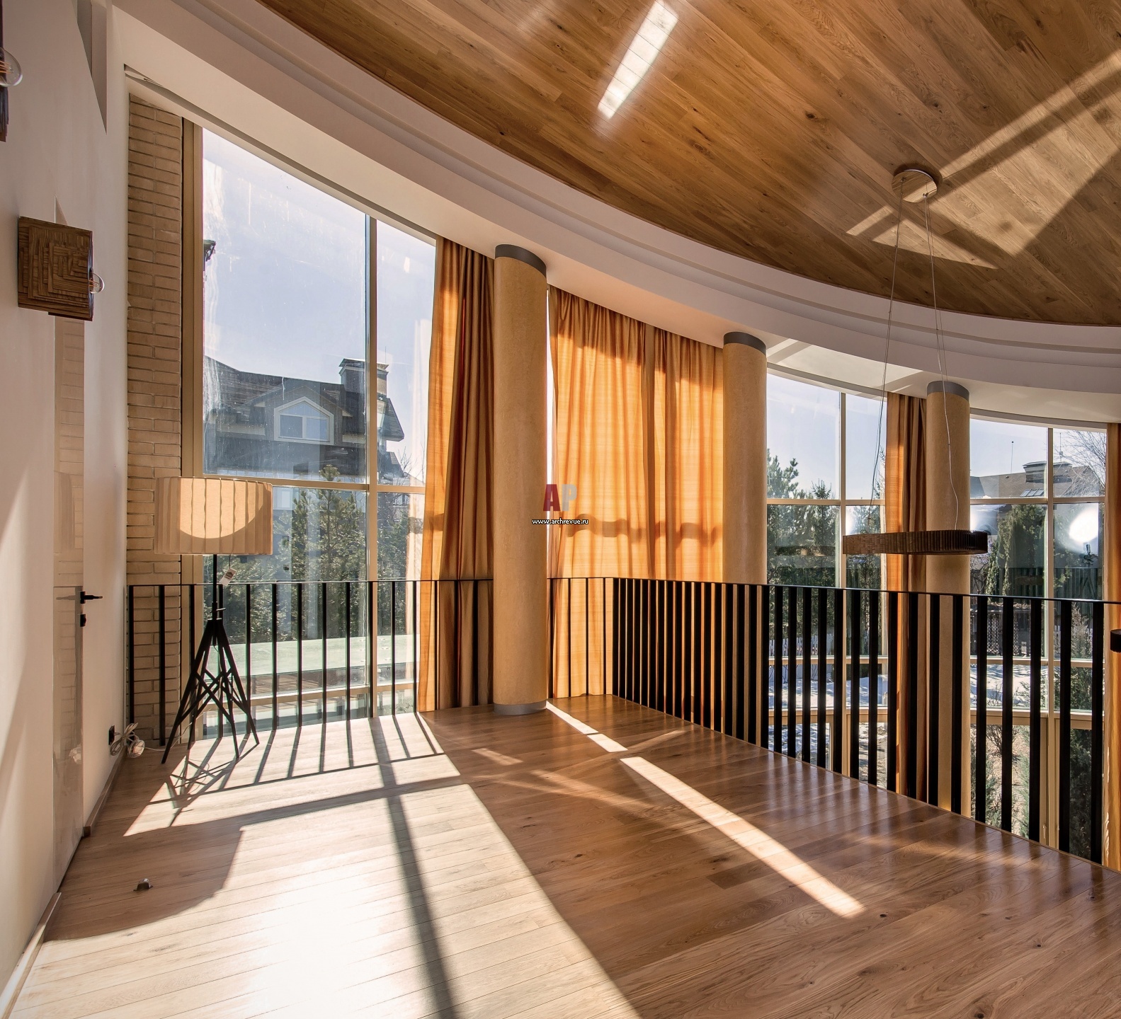 Балкон второго этажа. Панорамные окна позволяют солнечному свету заполнять все пространство, связывая природный пейзаж с уютной атмосферой внутри. Полы и потолок оформлены светлым дубом.