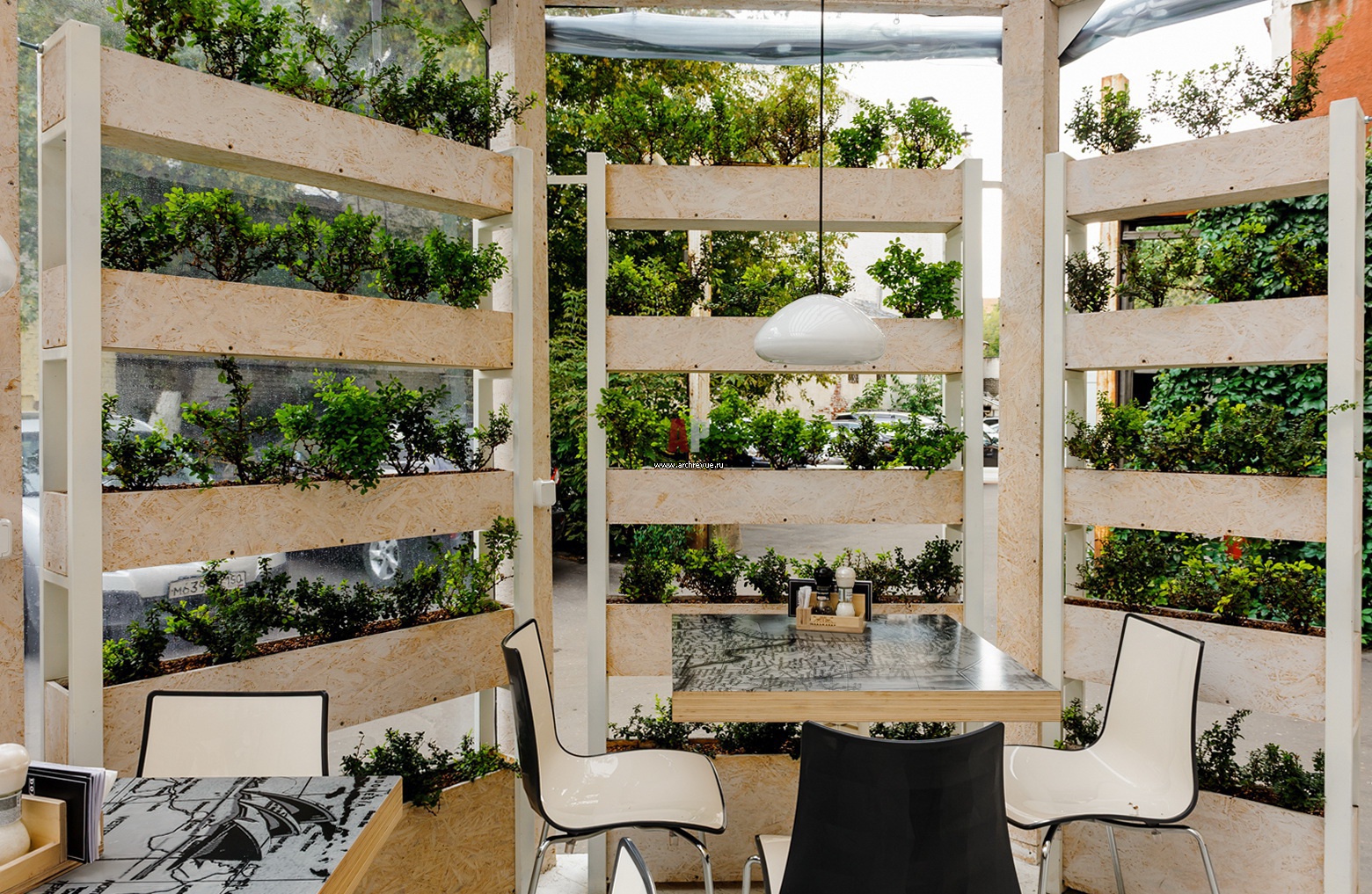 С улицы веранда отделена собранными из OSB-плит перегородками. Каждая перегородка представляет собой выстроенные друг над другом кадки с живыми растениями.