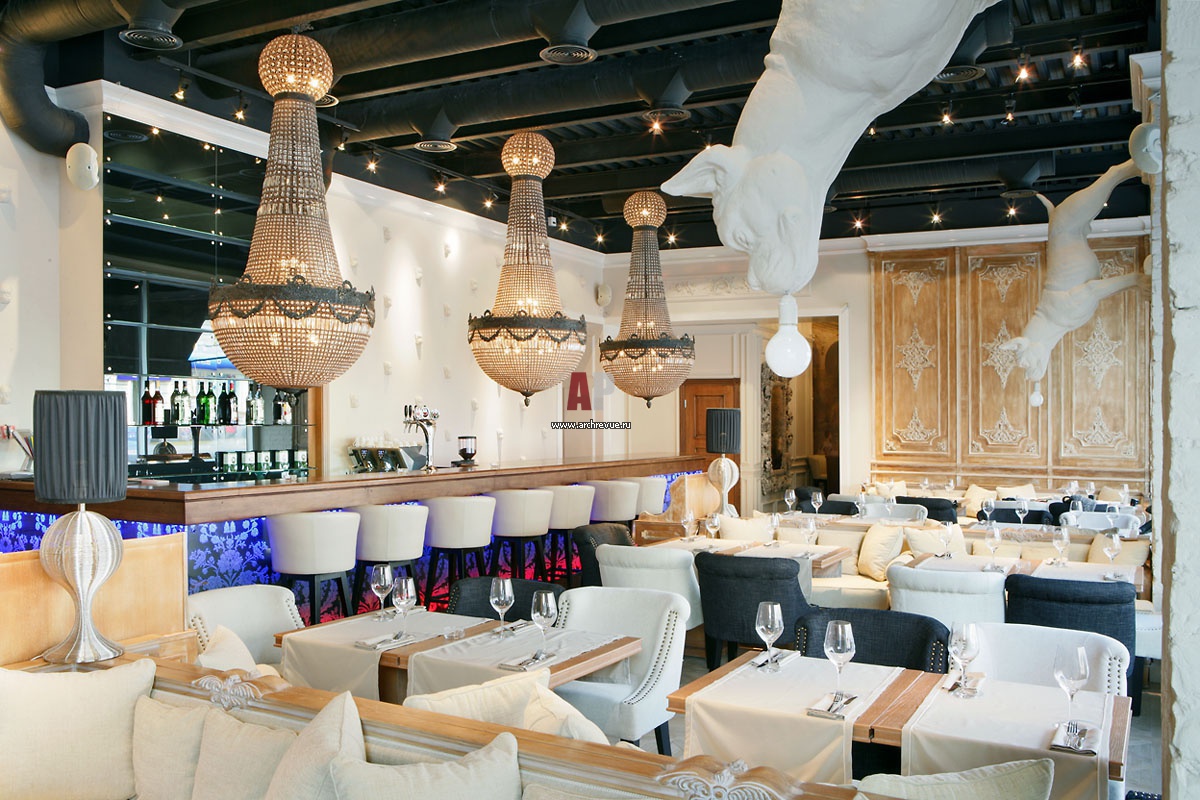 Образ ресторана – фигура перевернутого с ног на голову бульдога, который держит в зубах лампу. Оригинальный светильник создан по эскизам архитекторов. В поддержку к светильникам стены декорированы лепными собачьими мордами.