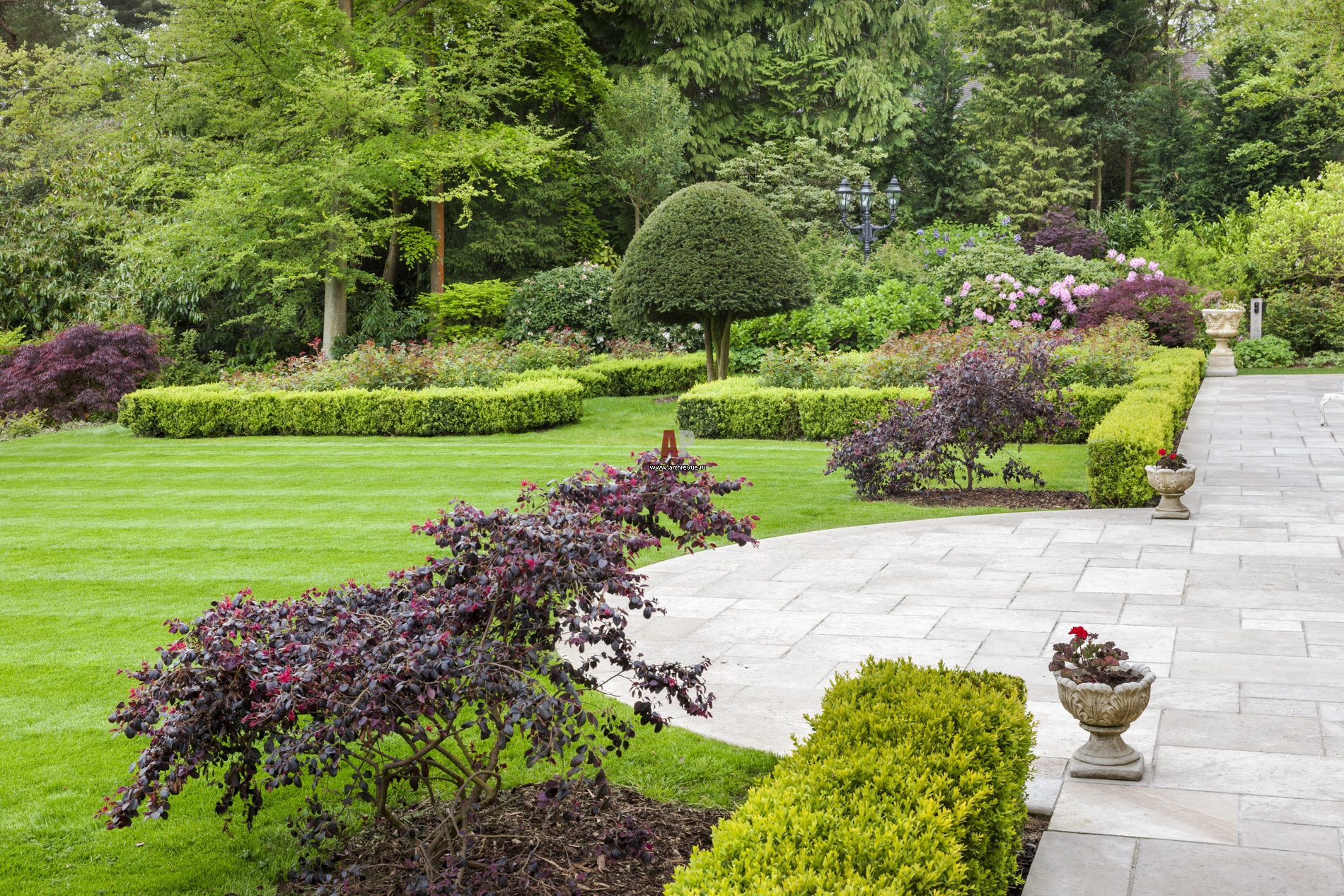 Терраса и партер вымощены плитами известняка в римской раскладке, поверхность которых специально была состарена вручную.