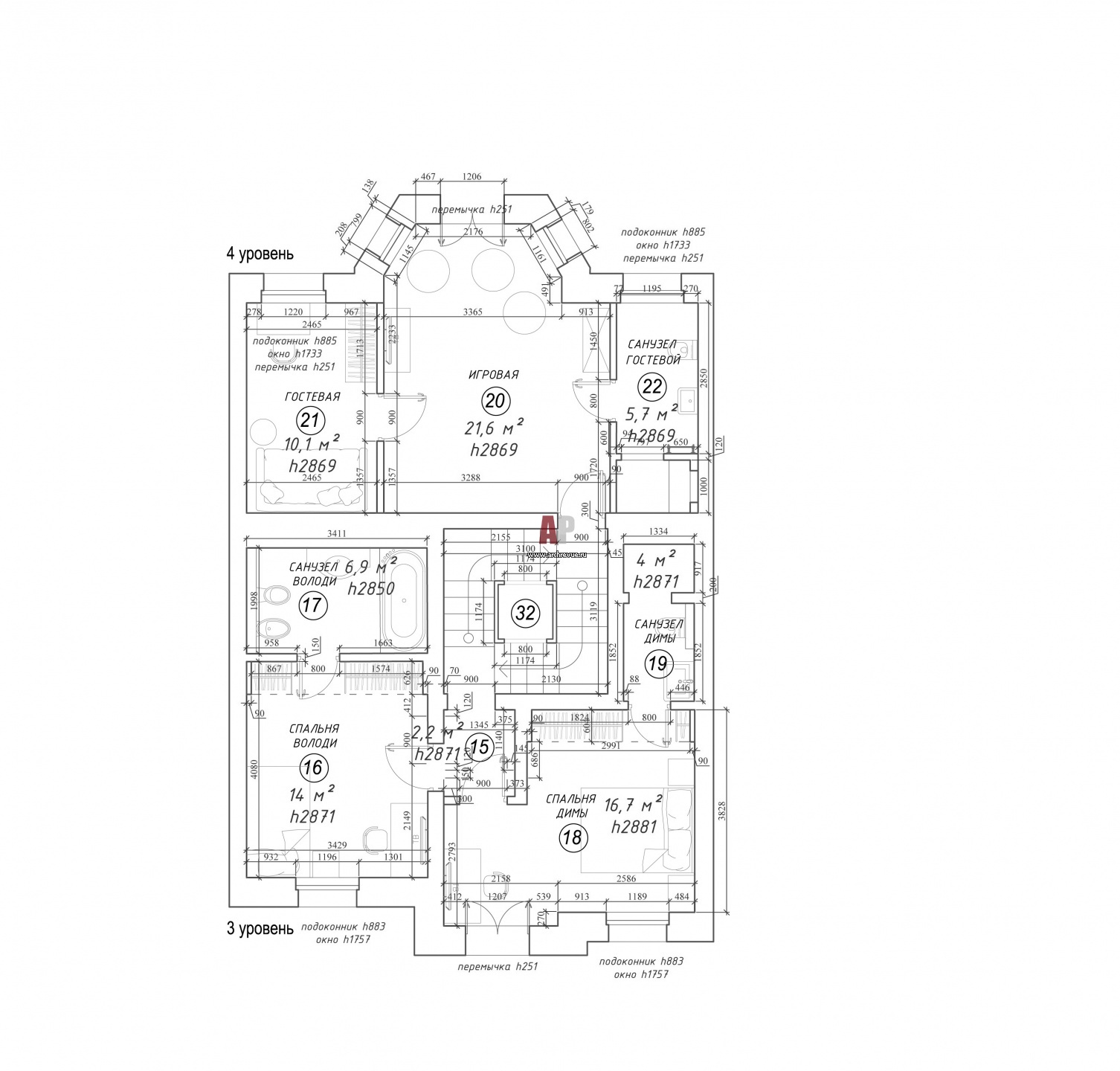 План третьего и четвертого этажей семиуровневого танухауса. Общая площадь - 320 кв. м.
