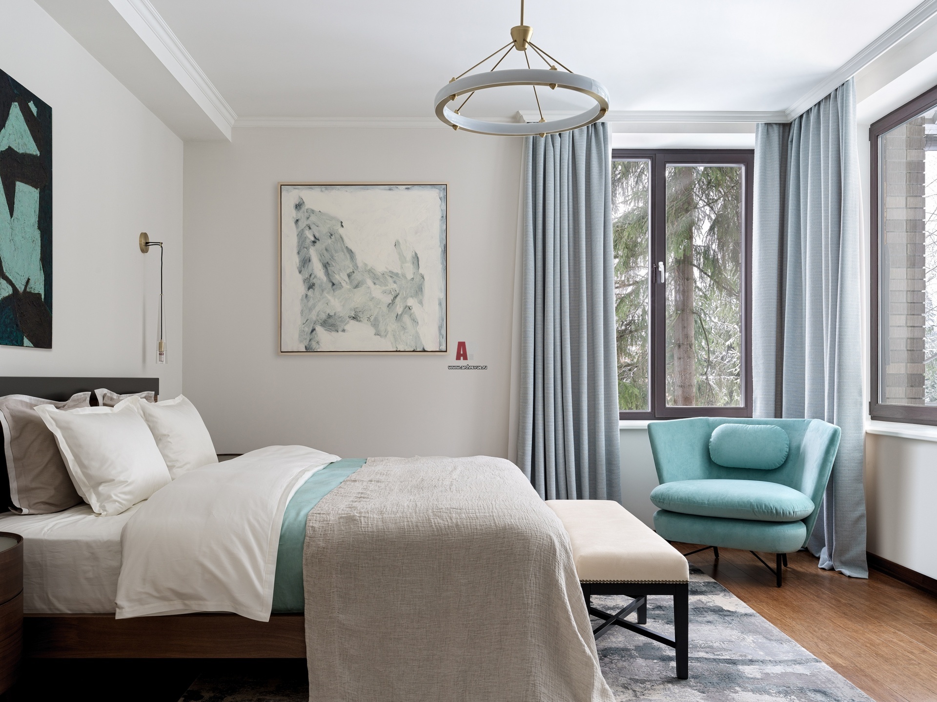 Хозяйская спальня на втором этаже. Кровать в помещении обращена на угловые окна. Кровать, BraginDesign. Прикроватные, тумбы Poliform. Кресло, One mebel. Люстра, Roll & Hill. Бра, Jonathan Browning Studios. Над изголовьем кровати картина «Между дождем и жаждой» работы Светланы Шебаршиной. На стене картина Ивана Глазкова.