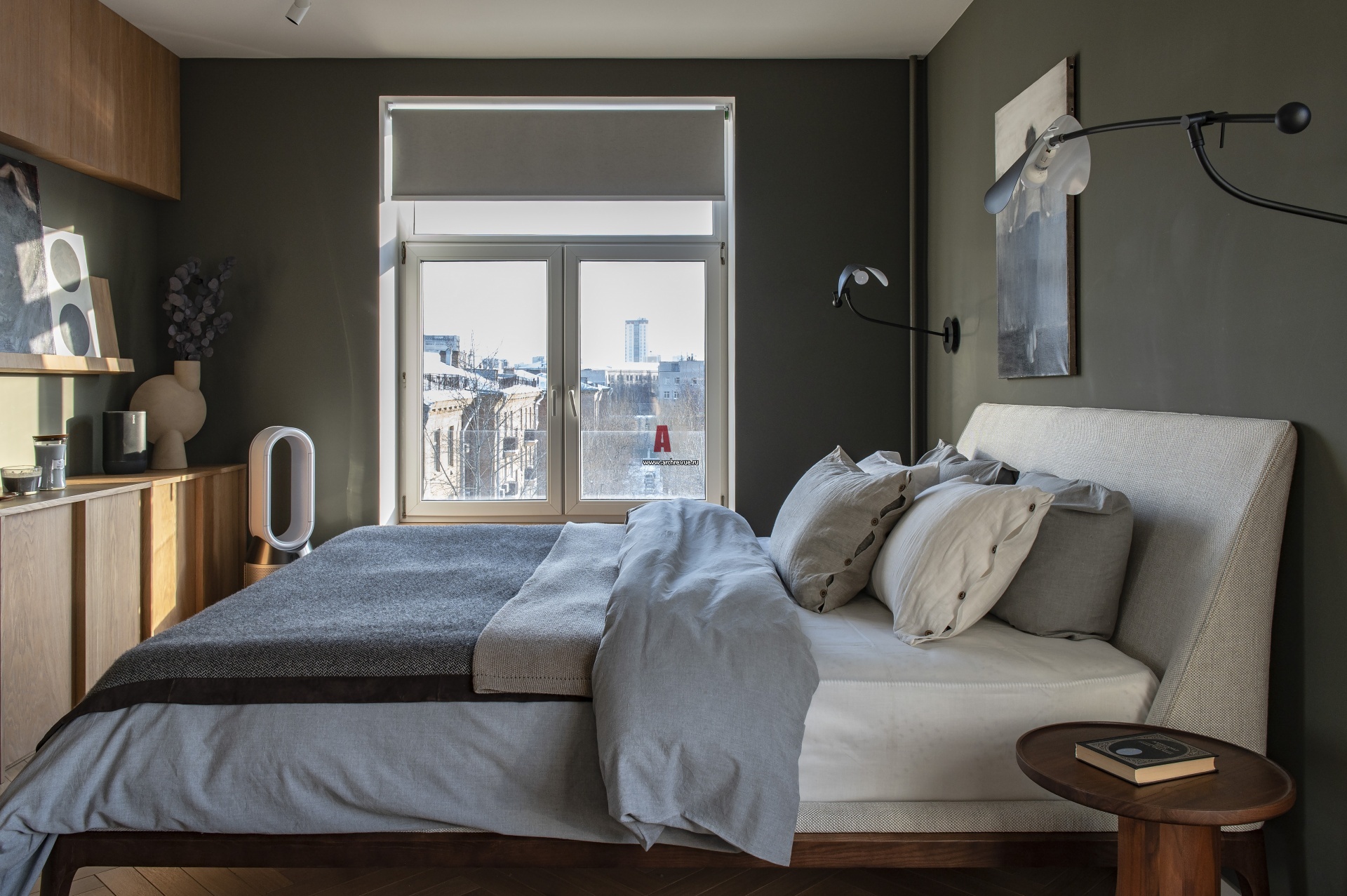 Квартира в сталинке с универсальным дизайном. Хозяйская спальня с темной болотной палитрой. Кровать, Artfabric. Бра и прикроватные столики, La Redoute.