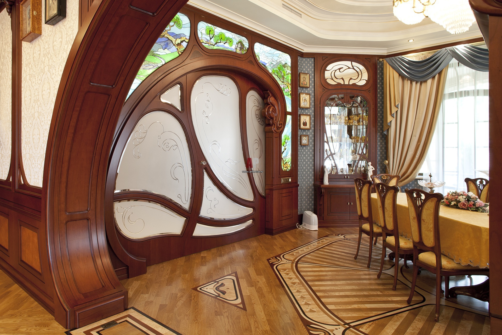 Интерьер столовой украшен открытыми радиусными порталами в стиле модерн с витражами.
