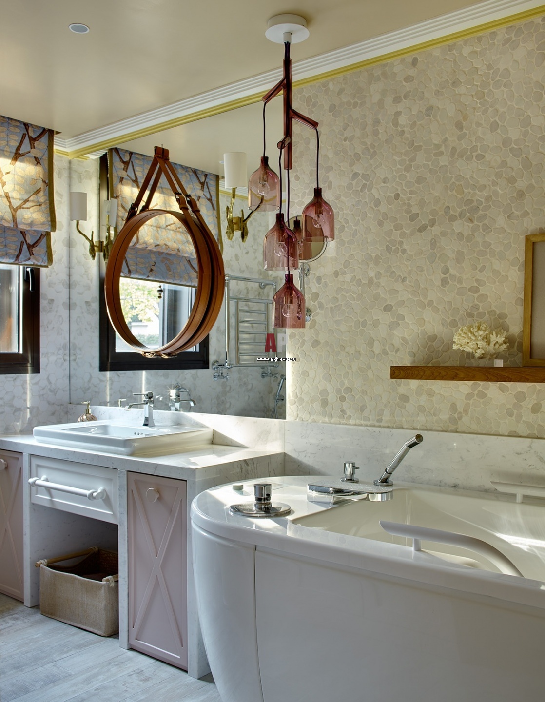 Интерьер хозяйской ванной комнаты. На стене – плитка, имитирующая речной камень.