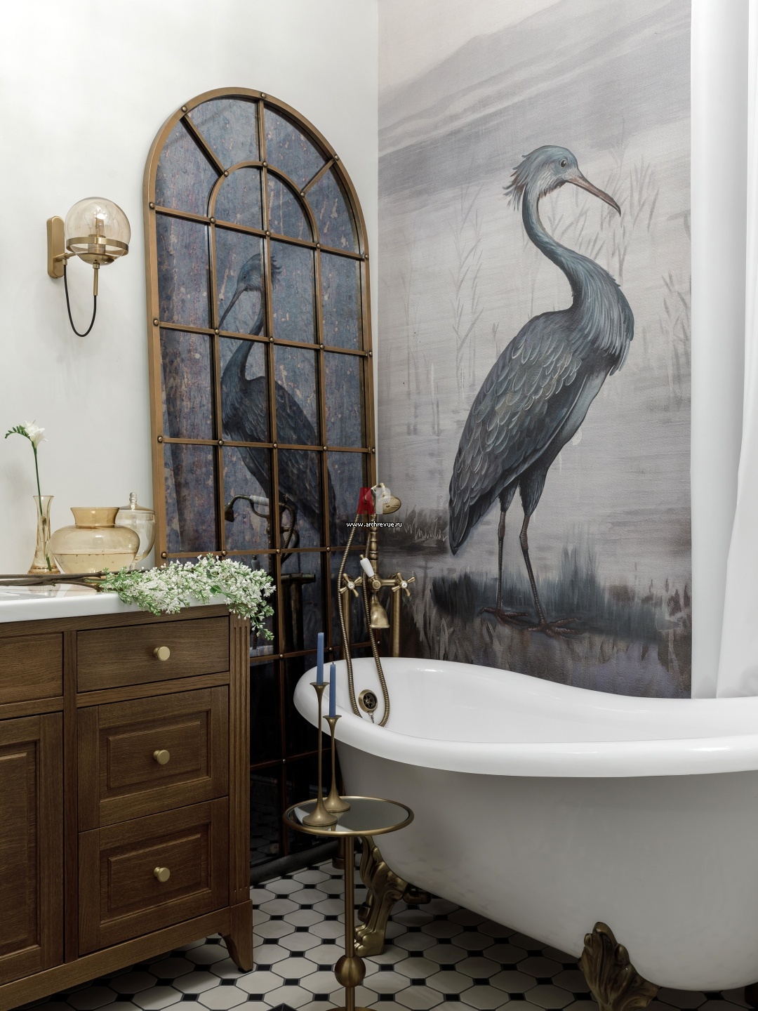 Ванная комната. В оформлении использовано панно с птицами и винтажный витраж. Отдельно стоящая ванна на львиных лапах, Astra-Form.