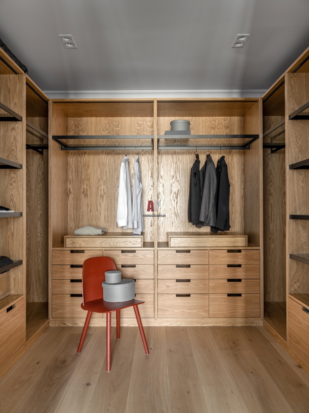 Вход в гардеробную организован из спальни. Мебель и стеновые панели выполнена из шпона дуба российскими мастерами. Стул, Muuto.