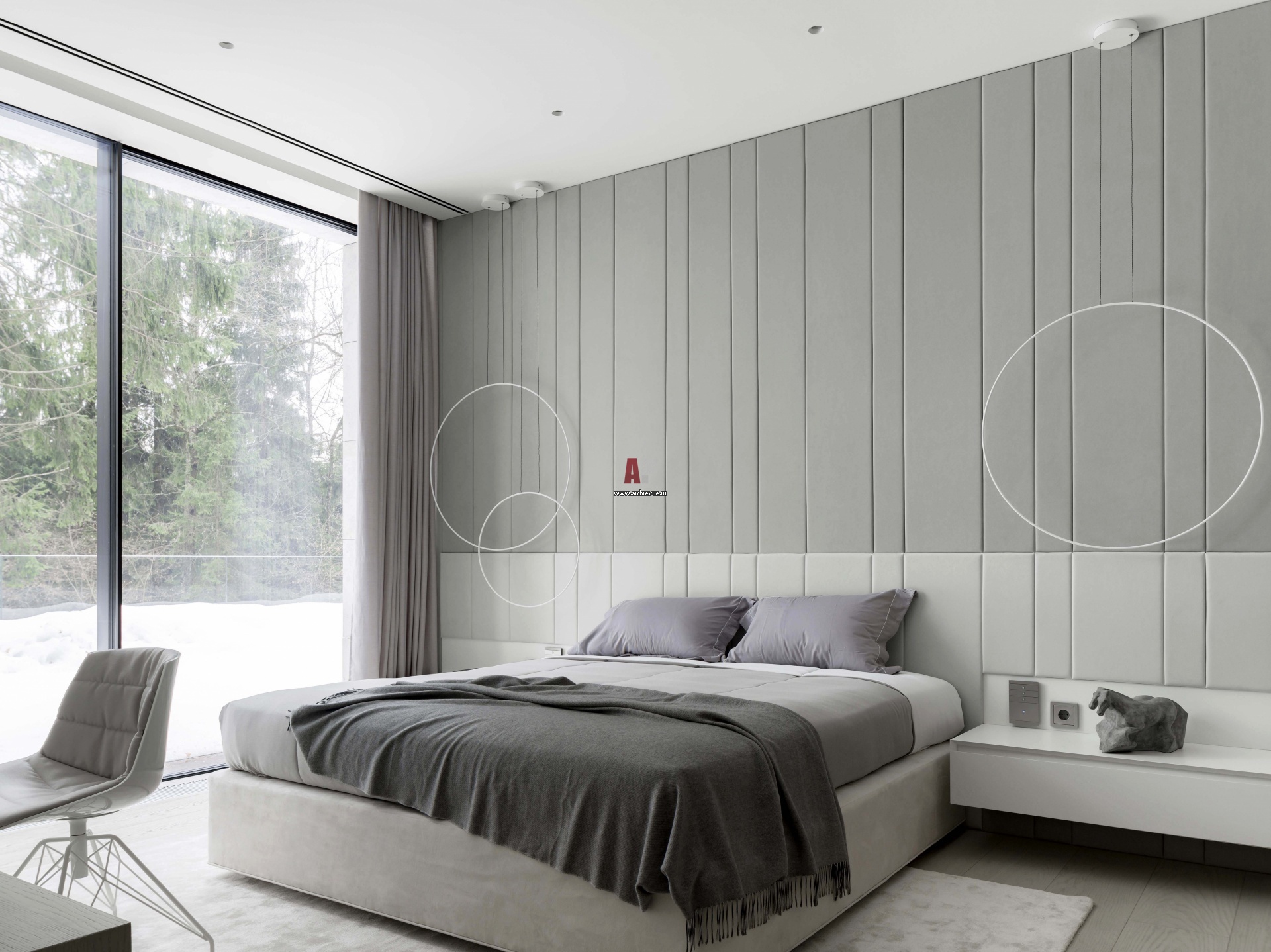 Гостевая спальня на первом этаже. В ней останавливаются дети хозяев, когда приезжают навестить родителей. За изголовьем кровати – текстильные панели с тактильной фактурой. Кровать, Vispring. Стулья, MDF Italia. Светильники-кольца, Cattelan Italia.