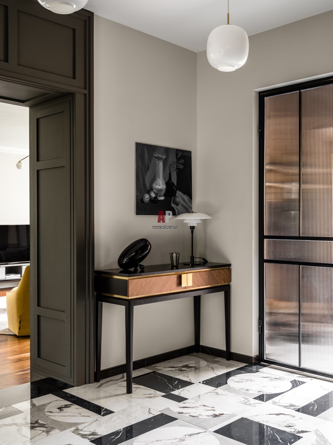 Фото прихожей. Консоль, Ambicioni. На полу – черно-белый керамогранит с геометрической раскладкой.