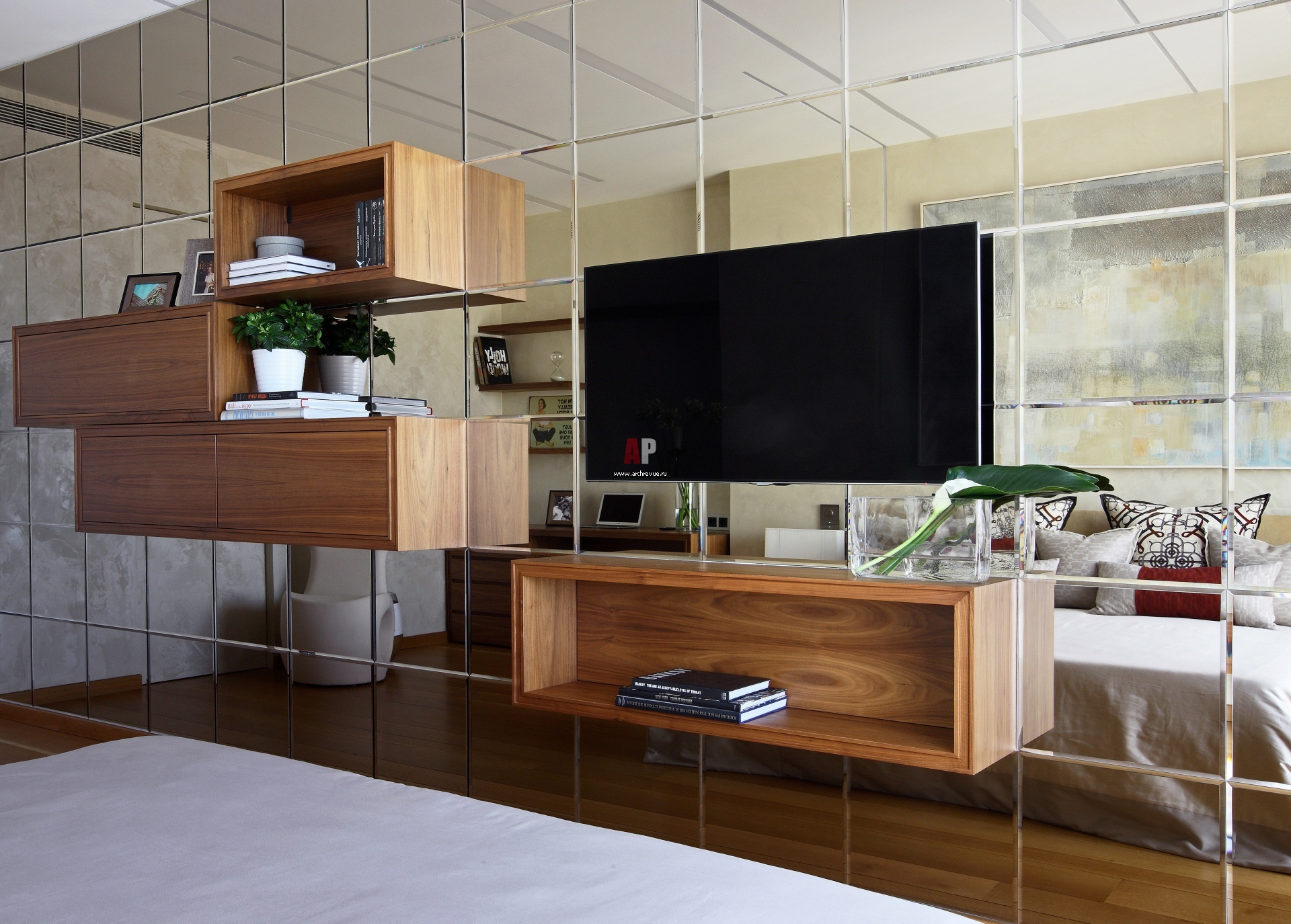 Зеркальная стена напортив кровати в гостевой спальне выполнена по эскизам.