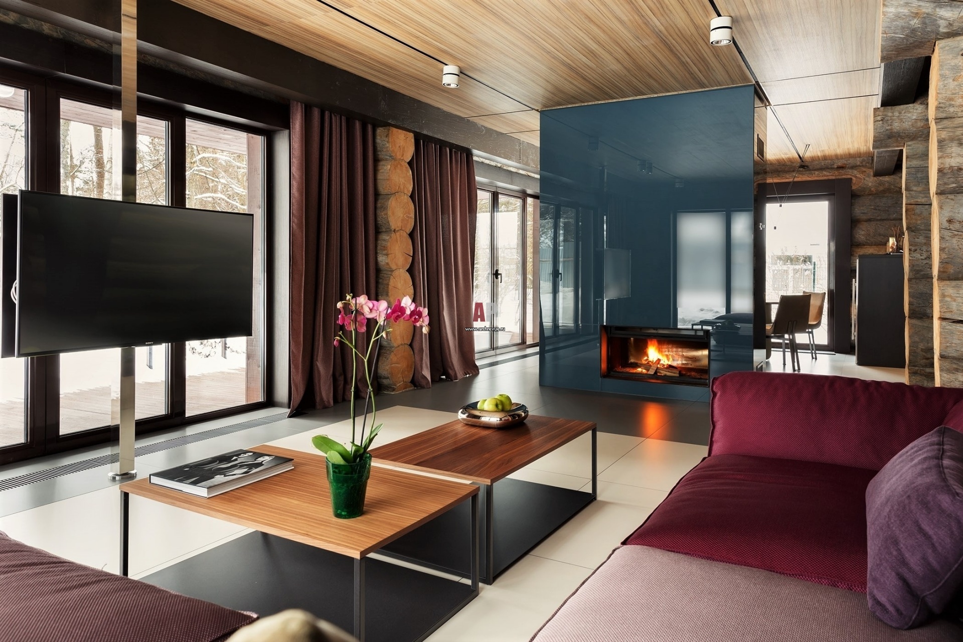Дровяной камин с живым огнем разделяет зону гостиной и кухни-столовой. Портал и дымоход облицованы лакированными бесшовными панелями насыщенного цвета. На полу – крупноформатный керамогранит, Kerlite, Arch-Skin.