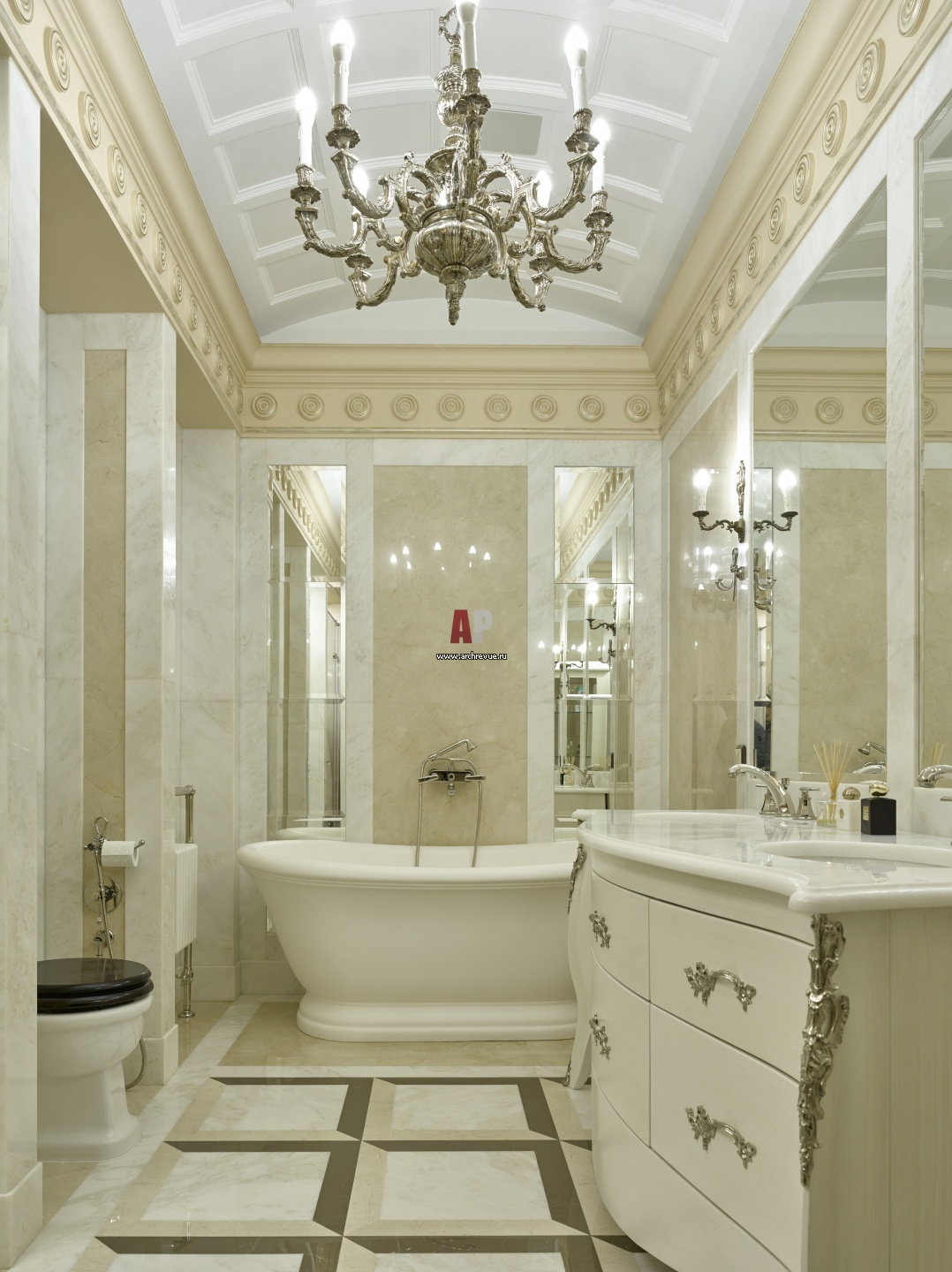 Интерьер ванной в классическом стиле. Комод с двумя встроенными раковинами выполнен на заказ в столярной мастерской. Ванна, Devon & Devon, модель Aurora Унитаз, Devon & Devon. Смесители, THG. Люстра, Martinez Y Orts S.A.. Бра антикварные.