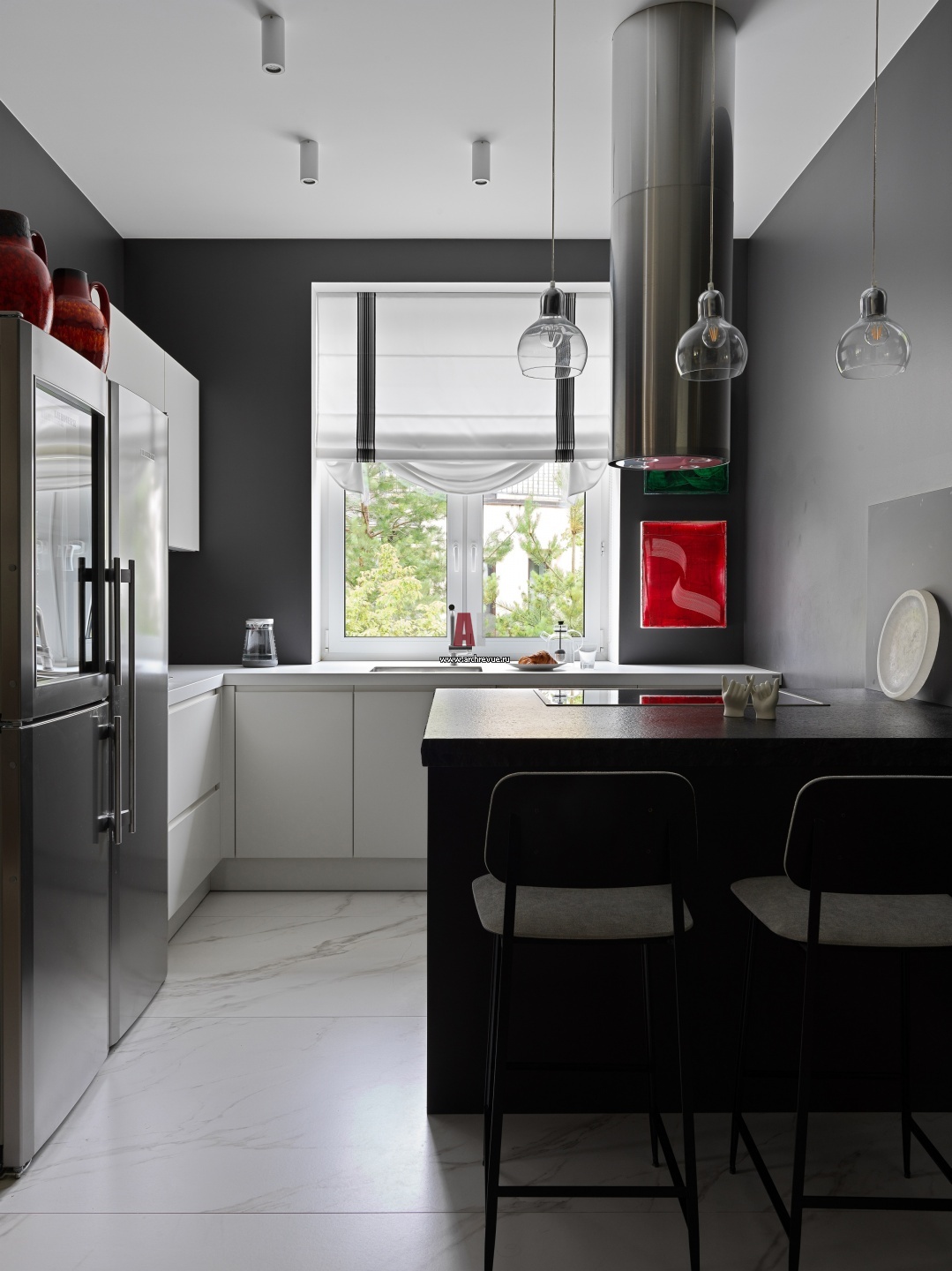 Кухня. Кухонная мебель с островом для аперитива, Leicht. Барные стулья, Ethnicraft. Столешница острова выполнена из вулканической лавы.