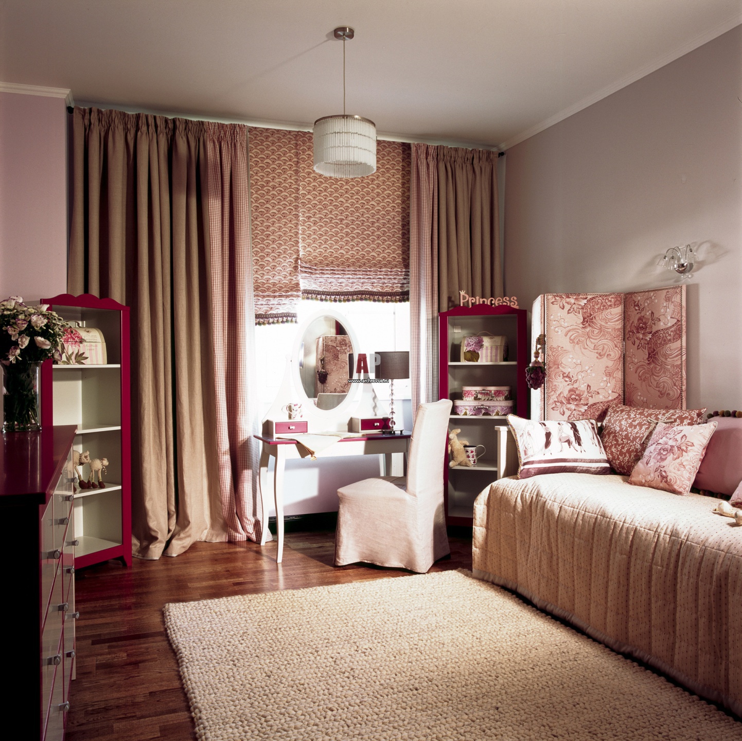Комната девочки выдержана в песочно-сиреневой цветовой гамме. На полу – паркет из ореха, поставщик «Элит-Декор». Письменный стол обыгран как будуар и придвинут к окну, закрытому рулонными шторами.