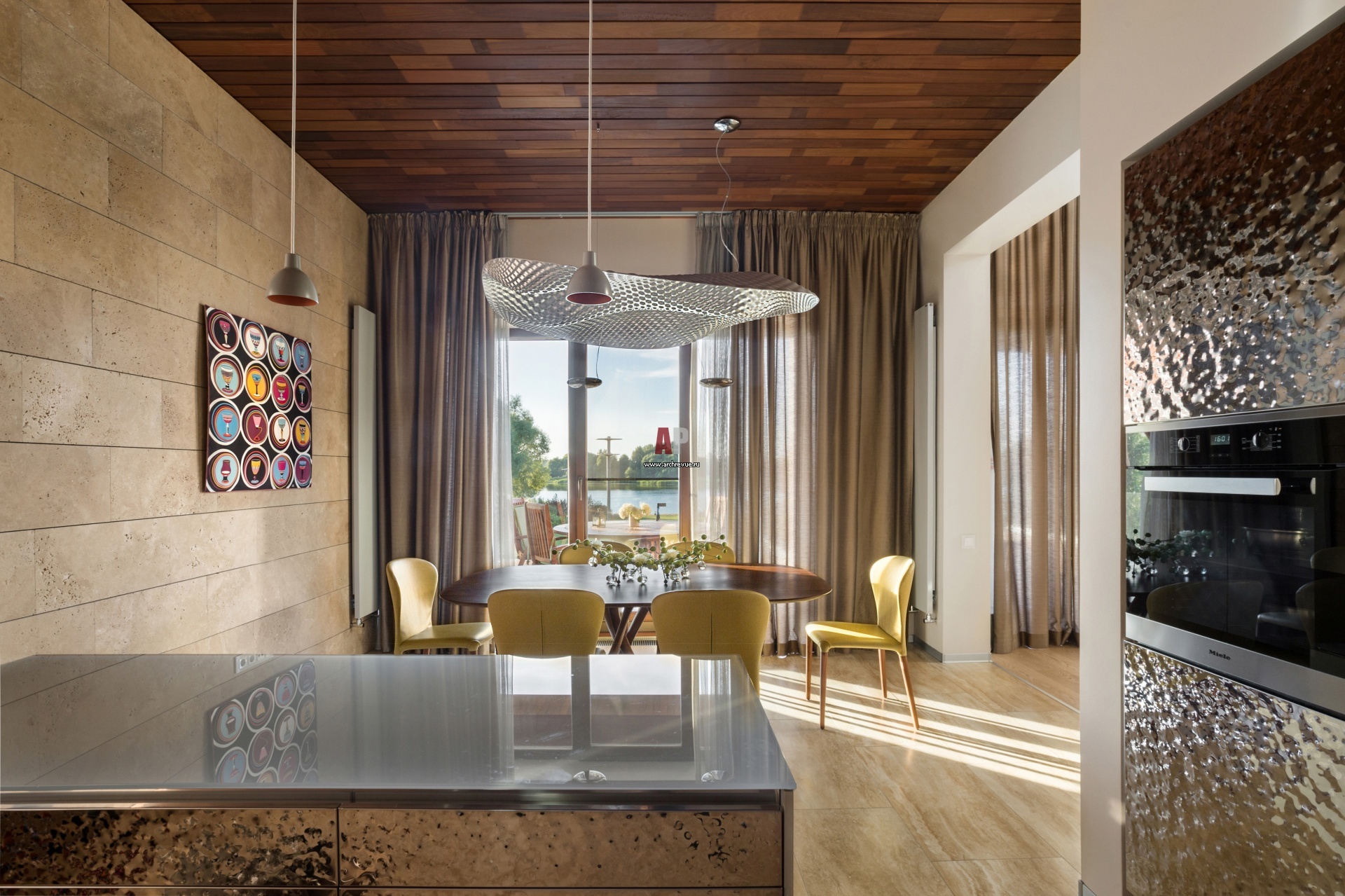 Дом на Волге с природными мотивами. Интерьер кухни. В оформлении использованы природные материалы: камень, дерево.