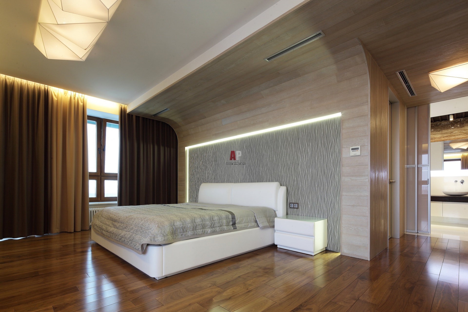 В интерьере спальни деревянная горизонтальная обшивка переходит со стен на потолок. В зоне изголовья кровати она образует полукруглый декоративный полог.