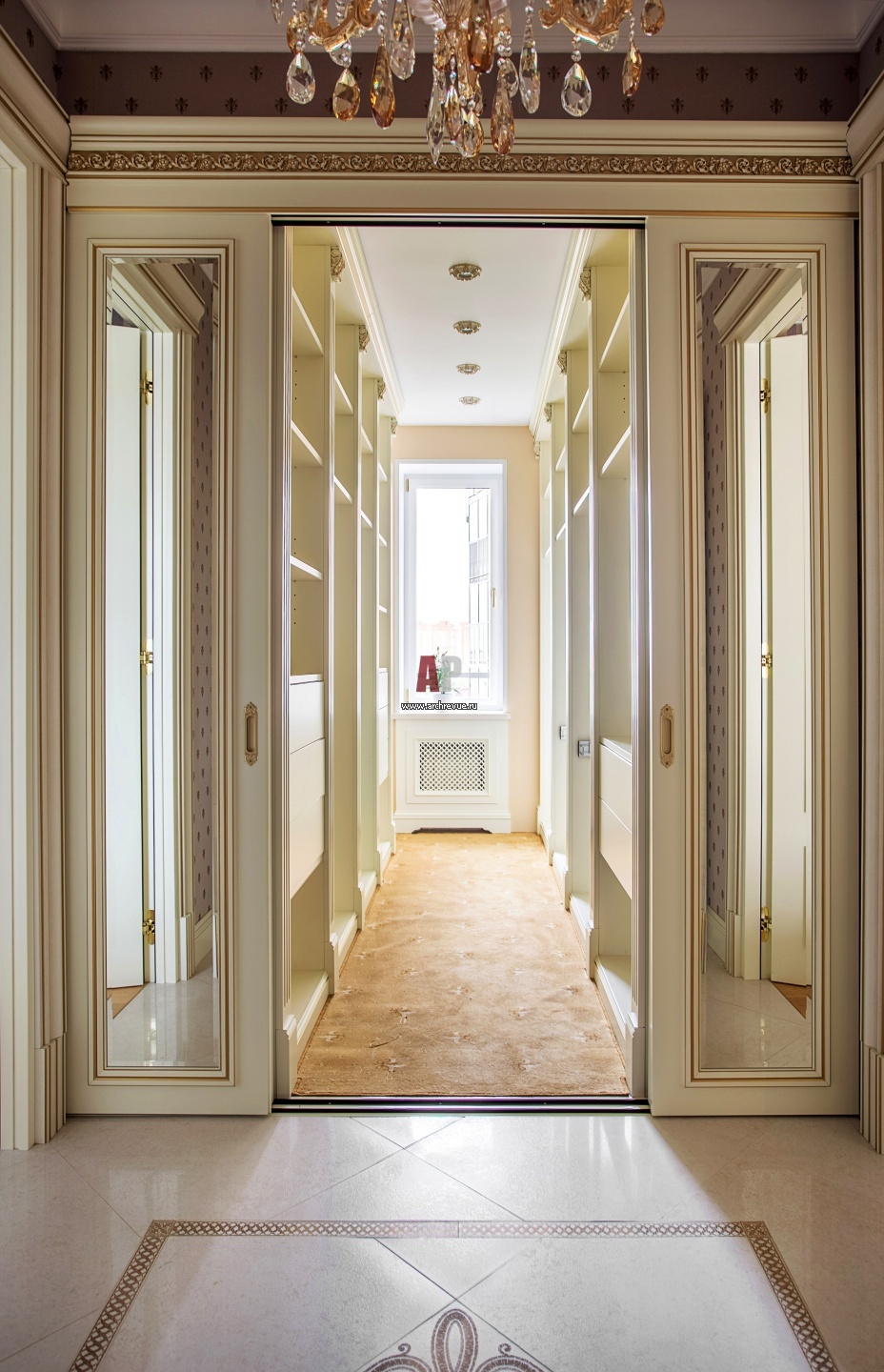 Интерьер гардеробной в классическом стиле. Раздвижные двери, системы хранения, решетка радиатора выполнены на заказ из дерева с финишем из белой эмали с патинированием.