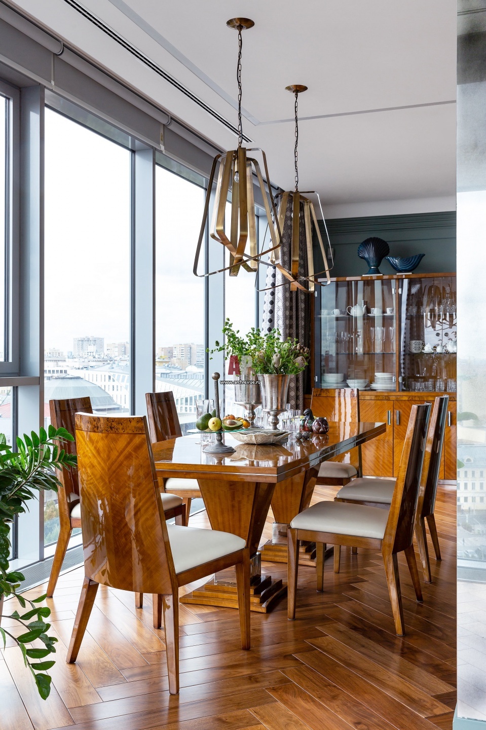 Заказчикам нравится лакированная мебель из рыже-медового дерева, отделки из кожи, камня, дорогие и качественные материалы в стиле ар-деко. Встроенные светильники, Panzeri. Светильники-подвесы, Metalarte.