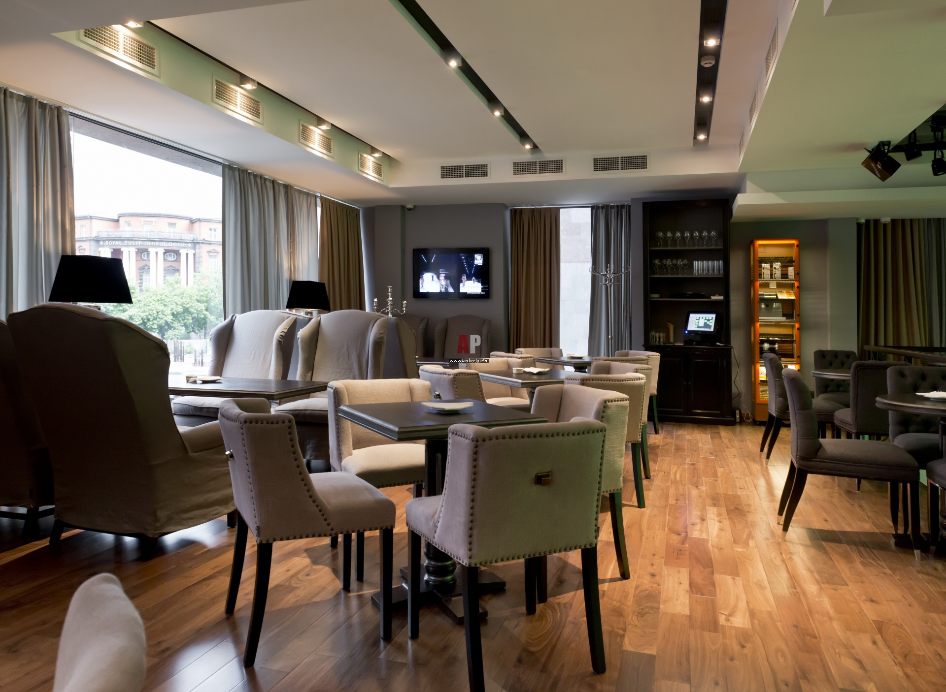Верхний зал ресторана выглядит респектабельно за счет американской мебели. Половая доска, орех, поставщик «Олимп Паркета».