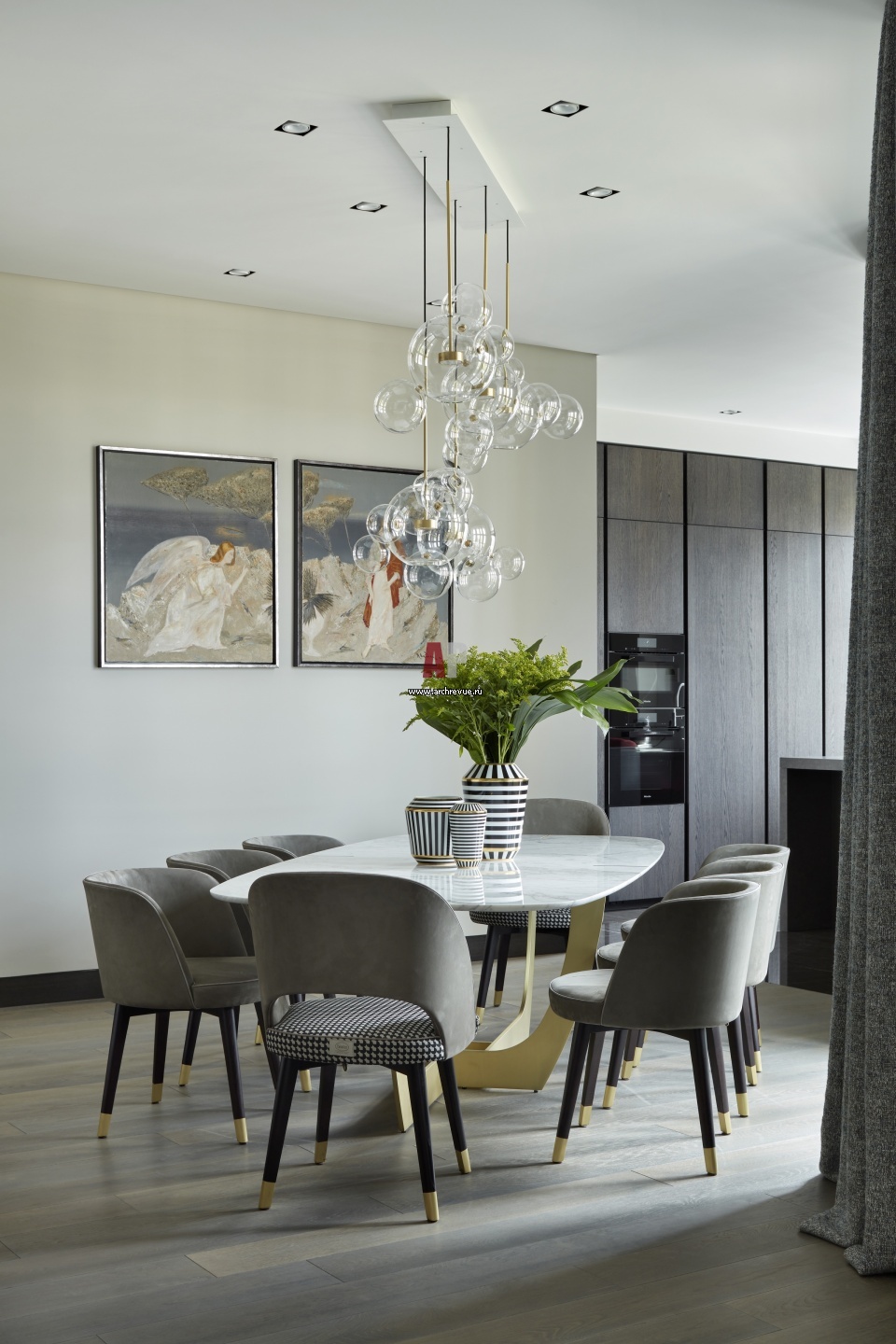 На полу всех жилых помещений массивная доска, дуб Nobless, серо-оливкового цвета, под маслом. Кухня в темном дереве, Modulnova.