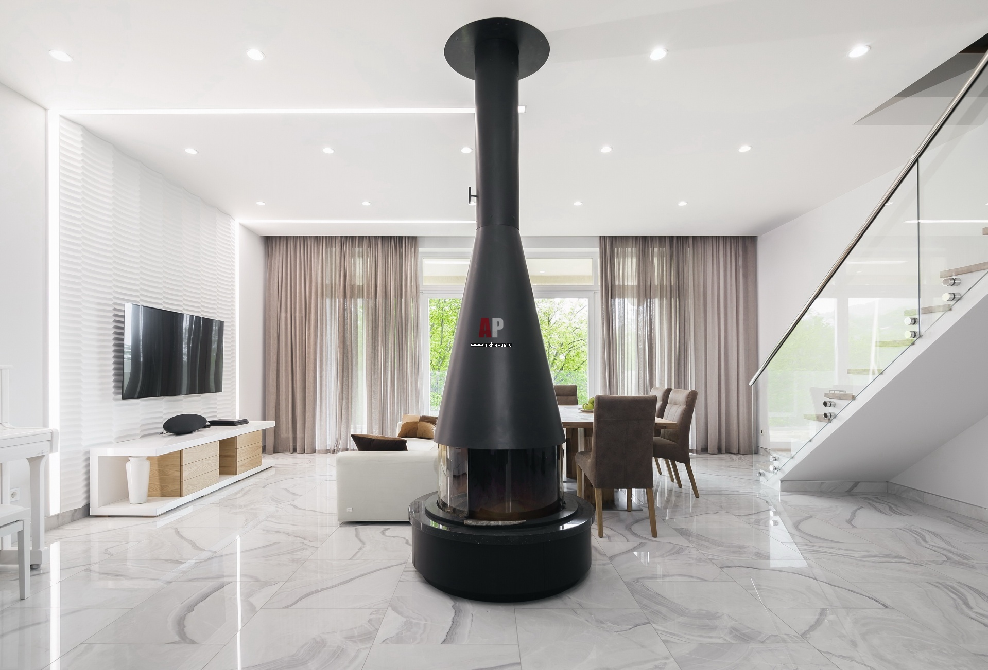 Фото интерьера курортной квартиры. Панорамный камин из черного металла – центральный элемент гостиной.