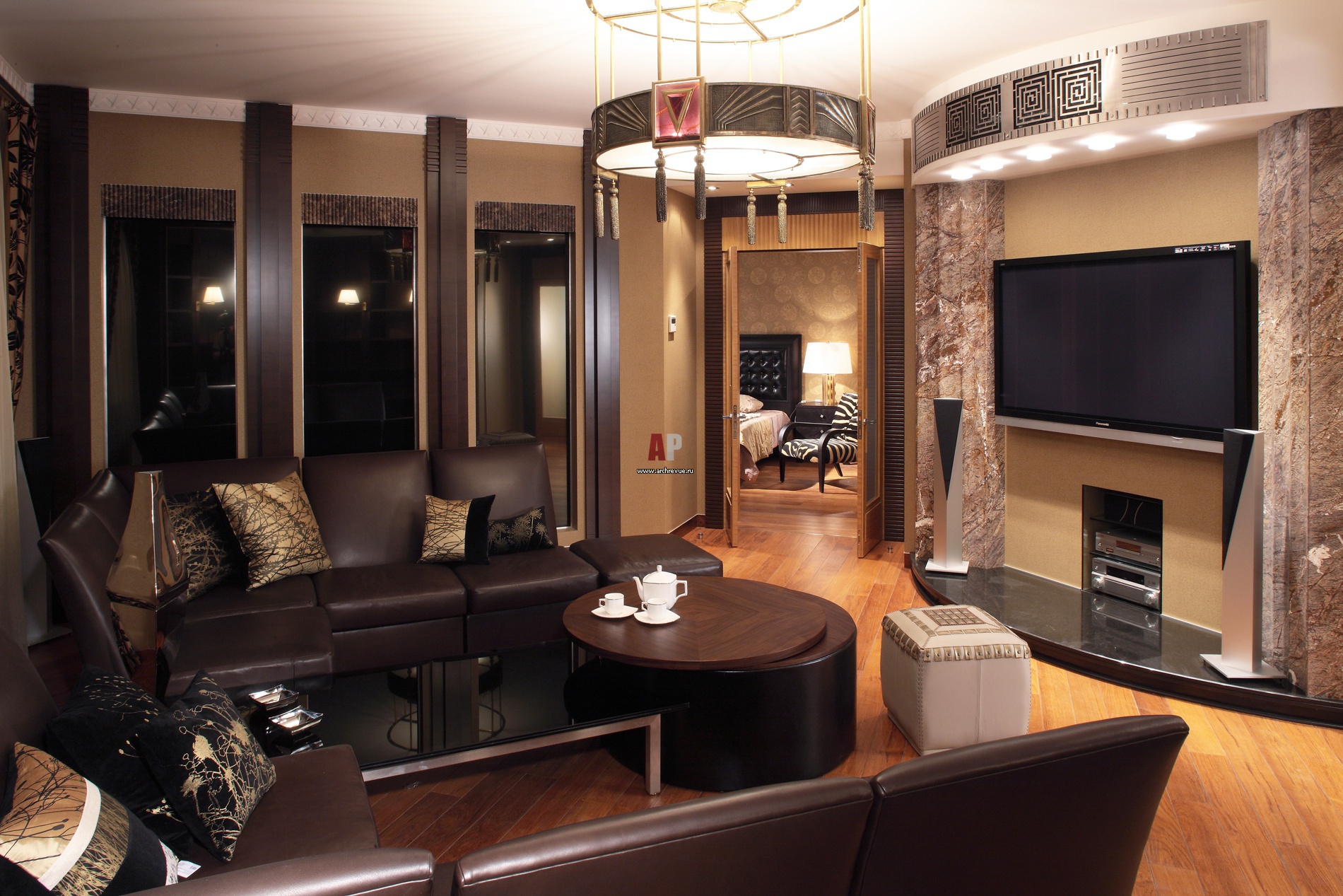 Диванная зона с ТВ. Колонны, обрамляющие подиум под телевизионную плазму, сделаны из мрамора. Декоративная металлическая решетка маскирует воздухоотвод. Пилоны из темного дерева с резьбой.