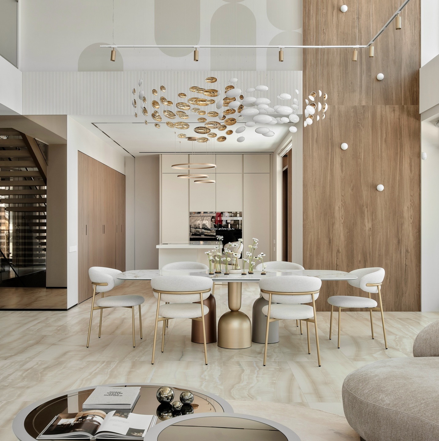 Открытое пространство первого этажа. Кухня выглядит камерно за счет заниженного (до 3- метров) относительно общего пространства потолка. Пространство кухни делится на 3 блока: пенал со встроенной бытовой техникой, остров с функциональным хранением и рабочая зона, где находится плита и мойка.