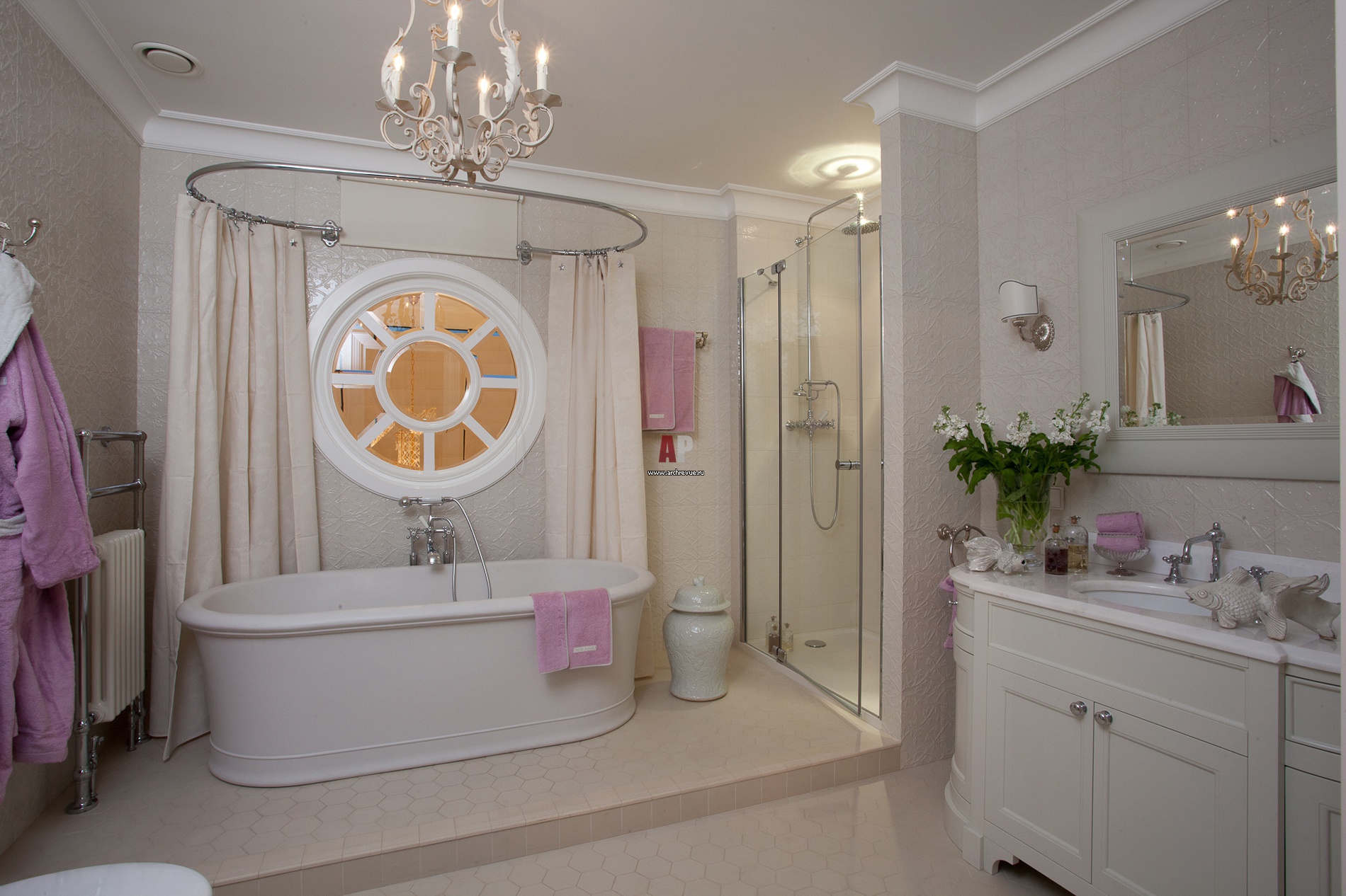Ванная комната при спальне дочери. Чтобы впустить в помещение дополнительный свет и создать настроение загородной виллы, архитектор «прорубила» круглое окно. Пол выложен из молочных шестиугольников метлахской плитки. На стенах рельефная белая плитка-майолика Cordoba (Doremail Тунис), поставщик «Красивая плитка» - подразделение компании «Грета Вульф».