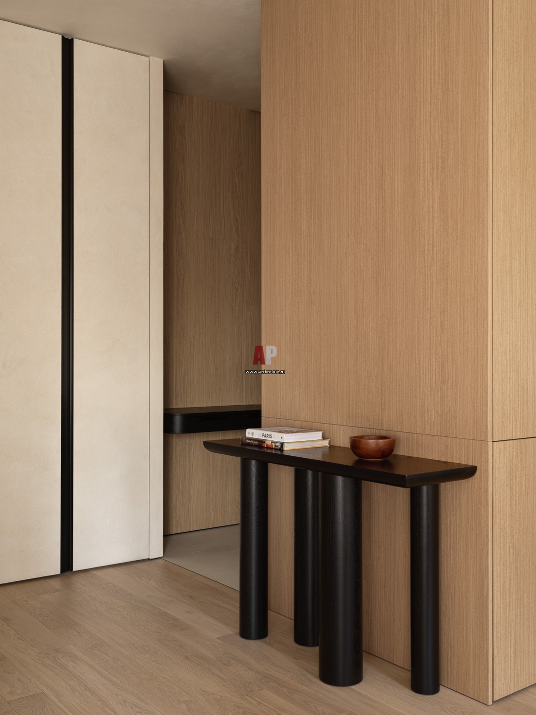 Прихожая. Интерьер квартиры строится на трех элементах: светлое дерево, бежевый микроцемент и контрастные кастомные детали.