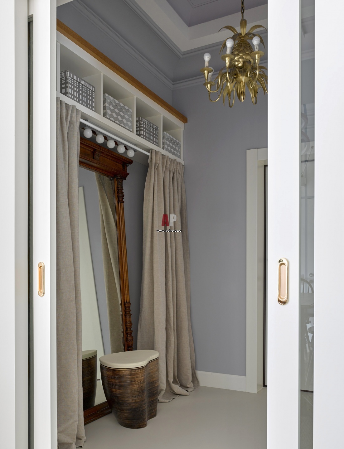 Интерьер входной зоны выполнен в лавандовых тонах. Белые раздвижные двери, на заказ.