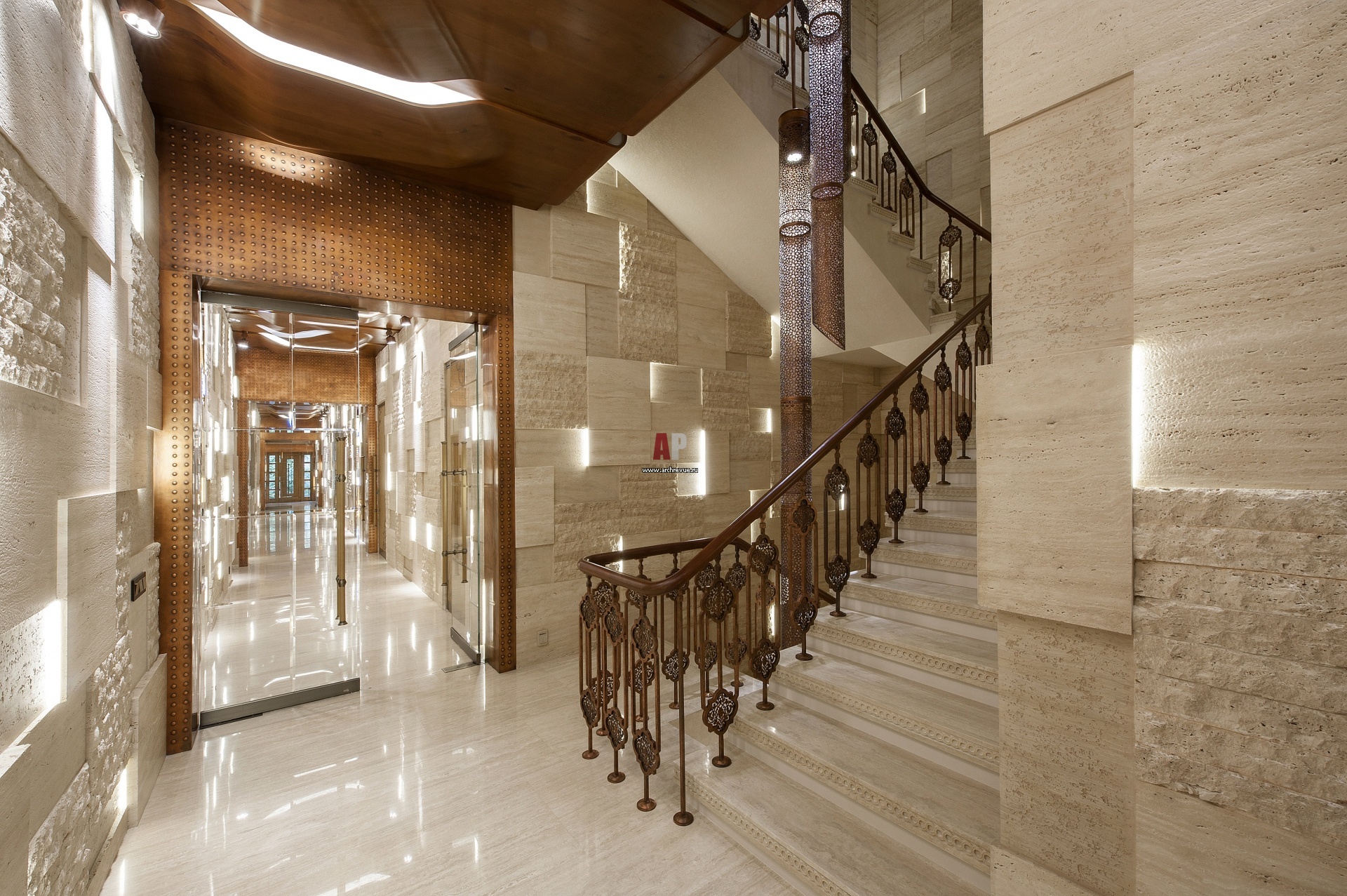 Лестничный холл. Стены облицованы травертином с античной фактурой. Волнообразный потолок склеивался из массива липы и тонировался в цвет «махагон».